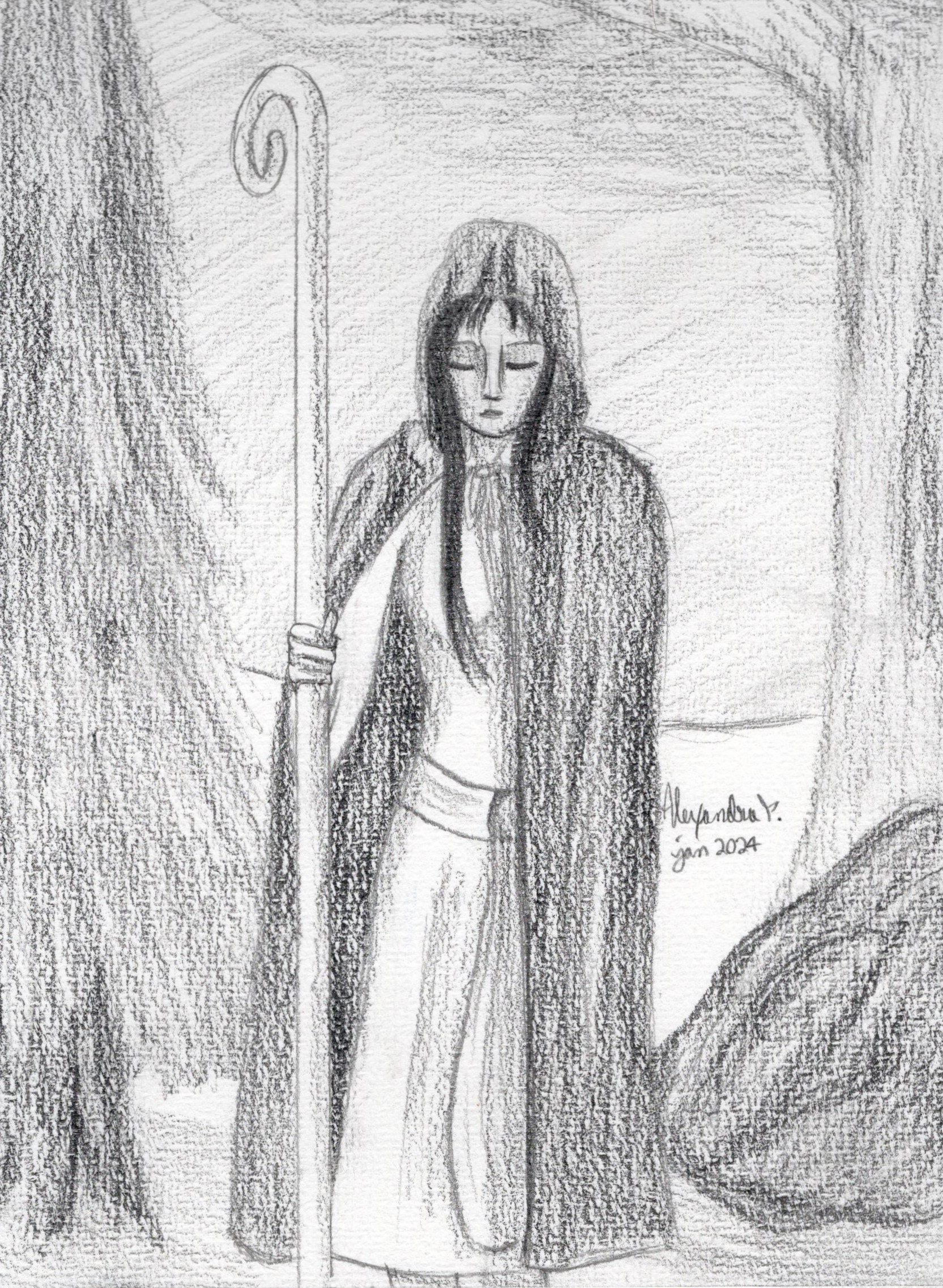 I saw a stock on Deviantart that inspired me. So, a random person walking in the forest. For those wondering, here the picture: https://www.deviantart.com/theposearchives/art/Female-Cloaked-Mage-Walking-with-Head-Down-1007898897
