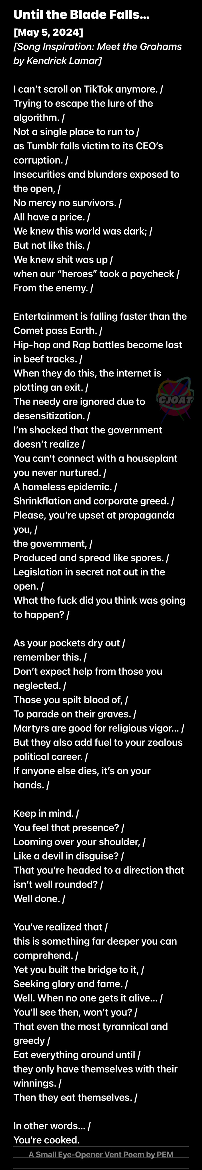 ## ALT TEXT # Until the Blade Falls... **[May 5, 2024]** *[Song Inspiration: Meet the Grahams by Kendrick Lamar]* I can't scroll on TikTok anymore. / Trying to escape the lure of the algorithm. / Not a single place to run to / as Tumblr falls victim to its CEO's corruption. / Insecurities and blunders exposed to the open, / No mercy no survivors. / All have a price. / We knew this world was dark; / But not like this. / We knew shit was up / when our "heroes" took a paycheck / From the enemy. / Entertainment is falling faster than the Comet pass Earth. / Hip-hop and Rap battles become lost in beef tracks. / When they do this, the internet is plotting an exit. / The needy are ignored due to desensitization. / I'm shocked that the government doesn't realize / You can't connect with a houseplant you never nurtured. / A homeless epidemic. / Shrinkflation and corporate greed. / Please, you're upset at propaganda you, / the government, / Produced and spread like spores. / Legislation in secret not out in the open. / What the fuck did you think was going to happen? / As your pockets dry out / remember this. / Don't expect help from those you neglected. / Those you spilt blood of, / To parade on their graves. / Martyrs are good for religious vigor... / But they also add fuel to your zealous political career. / If anyone else dies, it's on your hands. / Keep in mind. / You feel that presence? / Looming over your shoulder, / Like a devil in disguise? / That you're headed to a direction that isn't well rounded? / Well done. / You've realized that / this is something far deeper you can comprehend. / Yet you built the bridge to it, / Seeking glory and fame. / Well. When no one gets it alive... / You'll see then, won't you? / That even the most tyrannical and greedy / Eat everything around until / they only have themselves with their winnings. / Then they eat themselves. / In other words... / You're cooked. A Small Eye-Opener Vent Poem by PEM CJOAT WATERMARKED