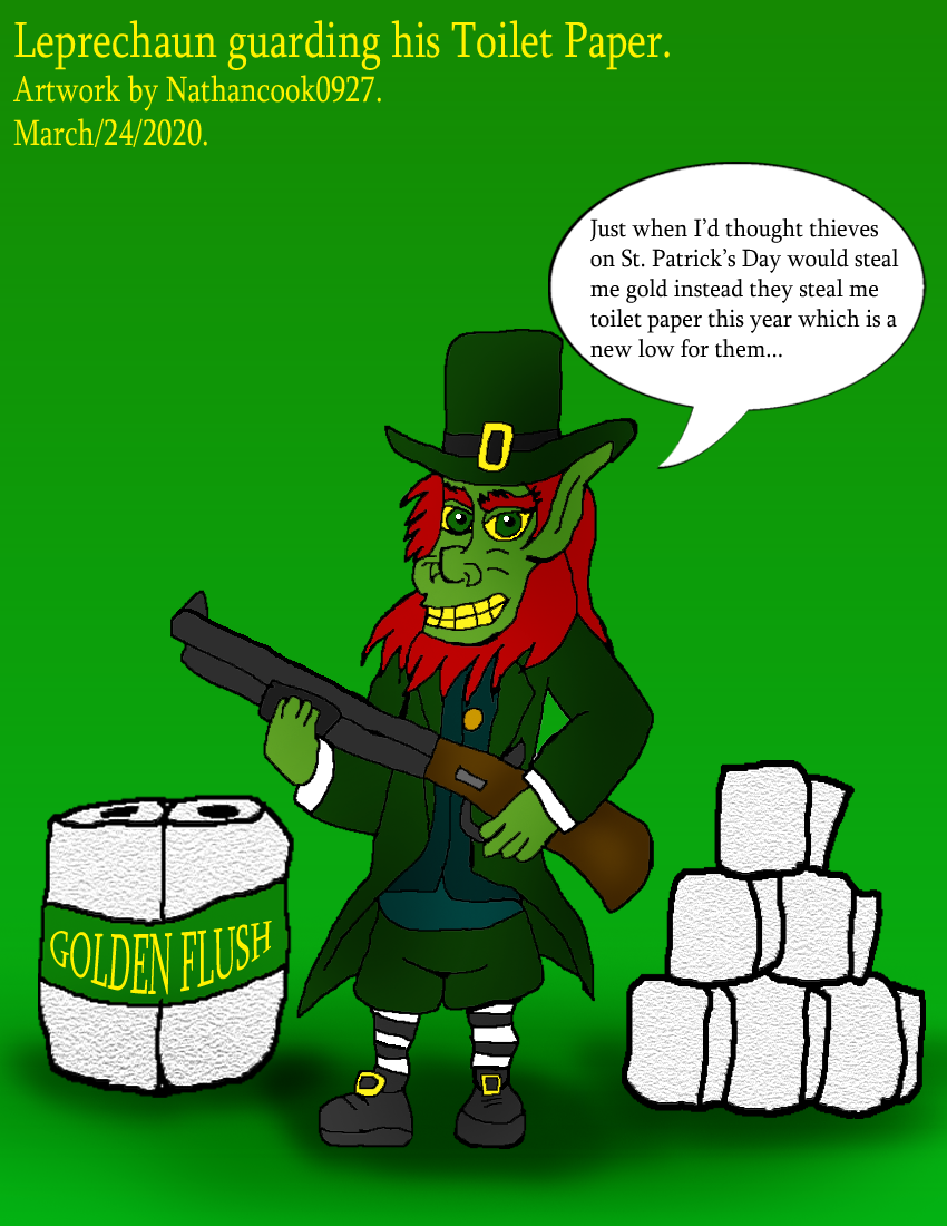 • In 2020 the Coronavirus issue and the crazy panic buyers were driving me nuts at the time when they took all the Toilet Paper I'd figure that what if people tried to take Leprechaun's toilet paper since it was now treated like gold at the time and yeah it sounds kind of silly but as a shopper I felt like that people took this whole panic buying behavior too far they were putting people's lives at risk of getting sick or worse getting the coronavirus and 3 years later things have been getting much better now that there a vaccine to combat it and the virus has been slowly getting phased out so I it'll be gone soon.