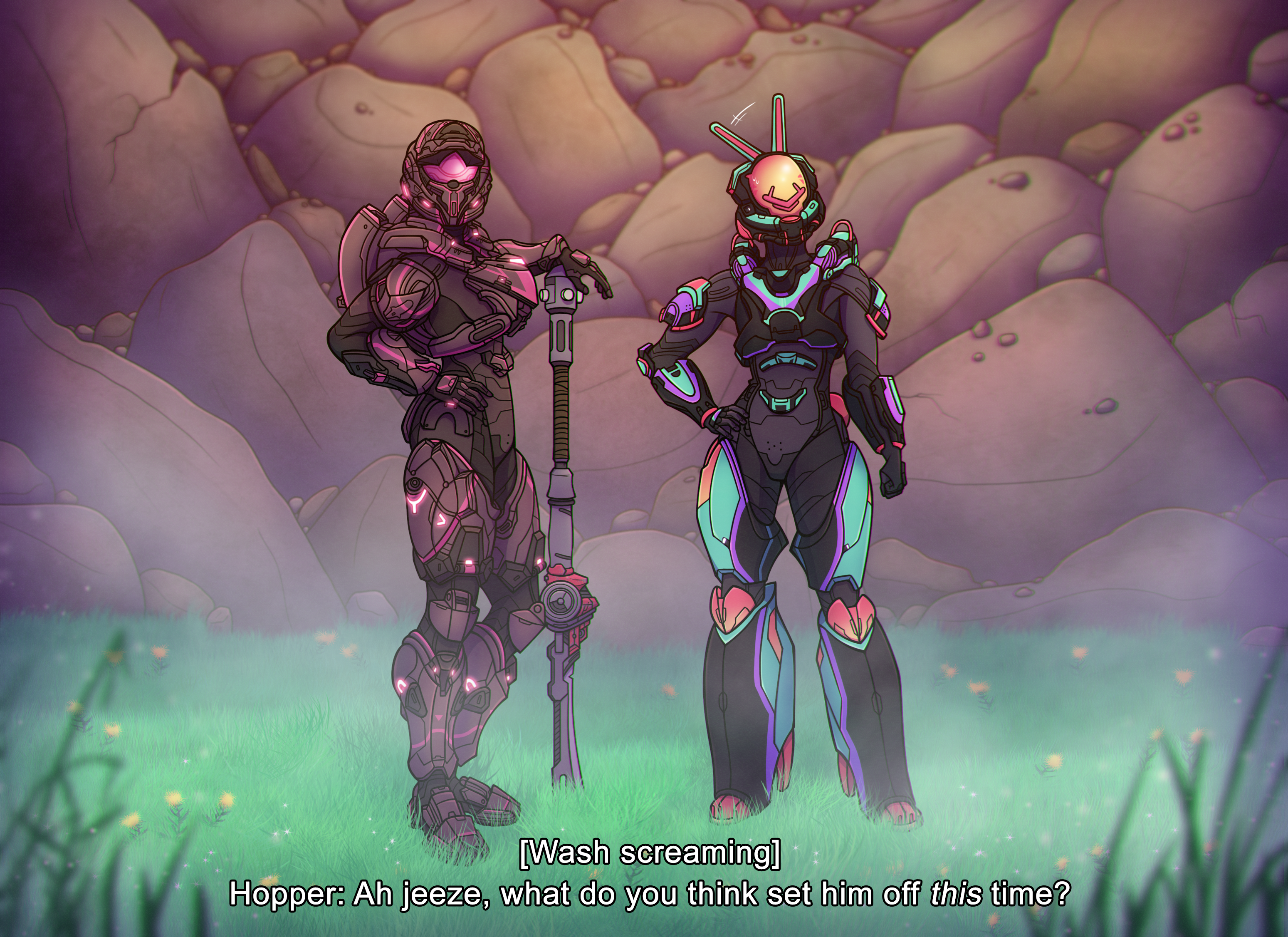 • A drawing of Hopper and @JaxBeetle's RvBsona, Azazel. I took some artistic liberty with Azazel to make their armor look a little more like it belongs to the Halo universe.