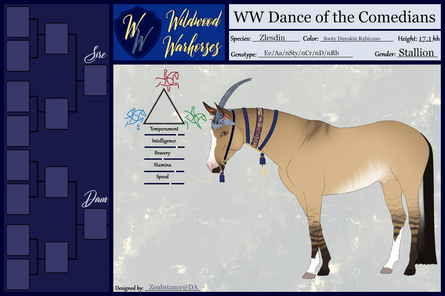 Show Name: WW Dance of the Comedians Barn Name: Victor Nicknames: Borge, Stripes [TH](https://toyhou.se/16530920.ww-dance-of-the-comedians) Breed: [Zlesdin](https://www.deviantart.com/zoubstance/art/Zlesdin-Anatomy-101-714757758) Gender: Stallion (male) Height: 17.1hh Age: 8 Registered with: [Zlesdin](https://www.deviantart.com/zlesdin) Phenotype: Sooty Dunskin Rabicano Genotype: Ee/Aa/nSty/nCr/nD/nRb Pedigree: -------------------------------------------- SSS: unknown ------------------- SS: unknown -------------------------------------------- SSD: unknown --Sire: unknown -------------------------------------------- SDS: unknown ------------------- SD: unknown -------------------------------------------- SDD: unknown -------------------------------------------- DSS: unknown ------------------- DS: unknown -------------------------------------------- DSD: unknown --Dam: unknown -------------------------------------------- DDS: unknown ------------------- DD: unknown -------------------------------------------- DDD: unknown Personality: A stallion with a sense of humor. He loves to prank whoever is handling him at the time. Gloves, hats, lead rope ends, it's all fair game. He refuses to be ground tied, and will pick up the dropped lead to follow where you go. Thankfully, he's a perfect gentleman under saddle, and is willing to keep the gait you ask for indefinitely. Discipline: Cross Country, Roping Completed shows on TH Accumulated art on TH Breeding: Open Offspring found [here](https://toyhou.se/~literature/159520.offspring)
