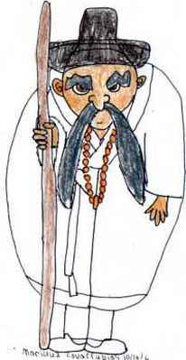 Appearance: A little old man with a long gray mustache and bushy eyebrows and bald. Wears an all white temple robe and a has a formal one for events.