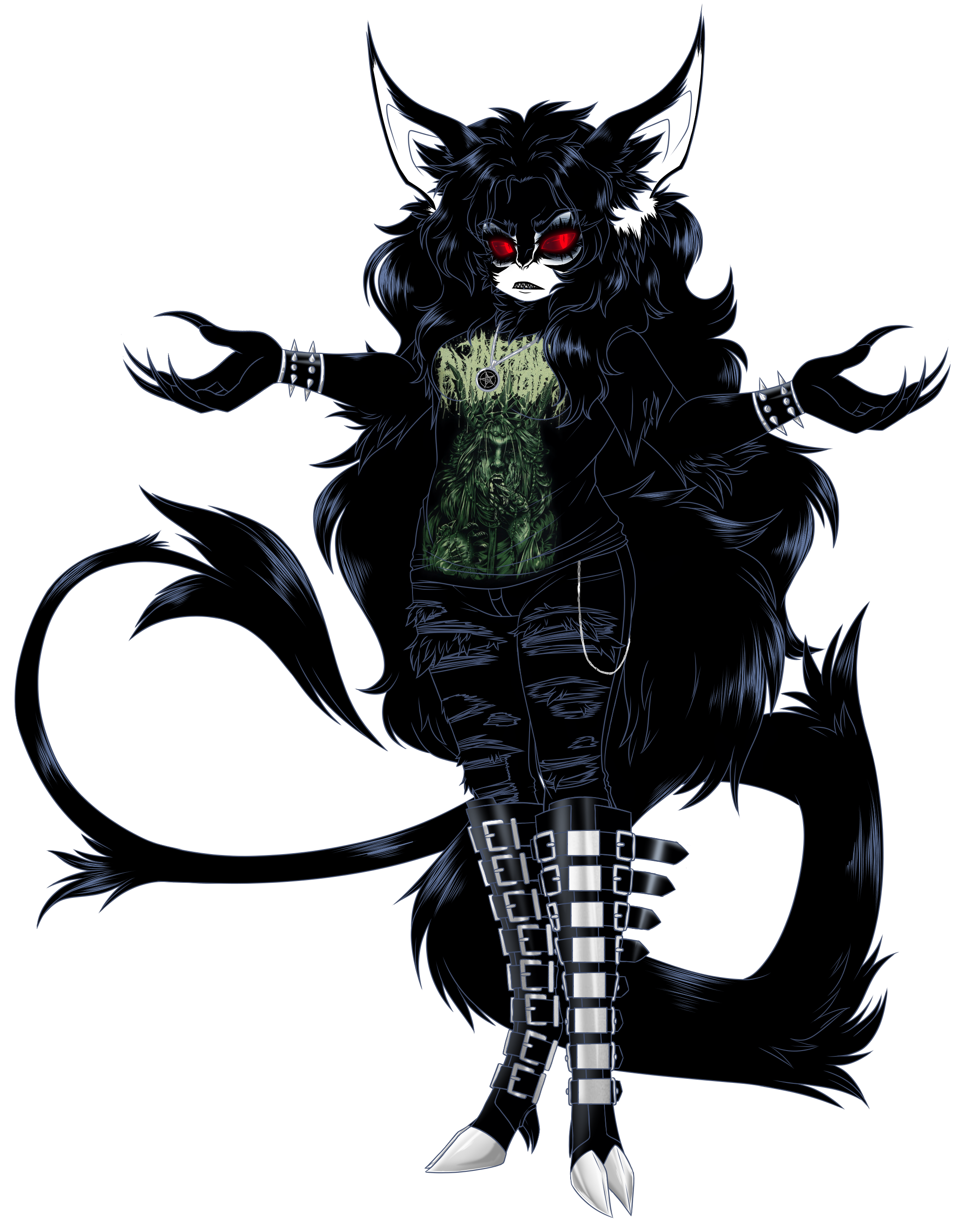 im new to this place so hello peeps. this is my persona or my main mascot . [name] - yenia but peeps mostly call her "unholy" as a nickname [age] - unknown [gender] - female [species] - a eldritch demon [personality] - creepy , edgy af, a bit of a crazed rocker , acts like a gremlin, sadistic in nature, has a dark since a humor, is a bit introverted, very cynical, can be nice if she likes a person and will be a loyal friend, can be a bit awkward do to lack of social skills, wont hesitate to put someone in a coffin if they push their luck to irritate her or anger her so she's definitely a killer, likes to do things only for her own amusement. [power/ abilities] - shapeshifting and mimic voices - fly - telekinesis - possession - regenerate - create and manipulate hell fire - summon other demons to do her bidding - see otherworldly beings and through a persons soul - hide within shadows and walk through solid objects - warp and manipulate reality to trick or mess with people - practices necromancy , curses and incantations using a book - immortal to an extent [weakness] - holy weapons - chaos energy can cause some damage - can be killed or defeated by demons similar to her kind or other higher beings. - those close to her endanger - needs souls or other power based being to consume in order to gain power if weakened or uses to much of it. [friends] - none, yet [romantic interest] - none never [sexuality] - aeromantic, asexual "no love exist here baby!" [other facts] - likes all genres of metal more so hardcore grotesque one's with disgusting deep gutturals, wears a shit ton of band shirts some pretty graphic, is a horror addict, draws alot, sees beauty in the most unlikely or disturbing things in morbid sort of way and loves chocolate. - likes to scare people and even scares them unintentionally since she tends to have a habit of appearing right beside or behind someone out of nowhere do to her being very quite when walking around so they don't know she's around. "this actually happens irl, its common that i scare people accidently cuz im too quite and appear next to them like fucking Michael Myers " - hates, is disgusted and scared of anything romantic or anything involving intimacy . especially when its directed at her and hates being touched in any way. [origin] - the inferno she's just a demon who left the inferno and made a home in the mortal realm of mobius to mostly mess around and cause a bit of chaos just for fun. she disguises herself to look like a mobian to somehow blend in to this world and never shows what she truly looks like since her true form cant be comprehended by mortal minds and all that cosmic horror jazz.