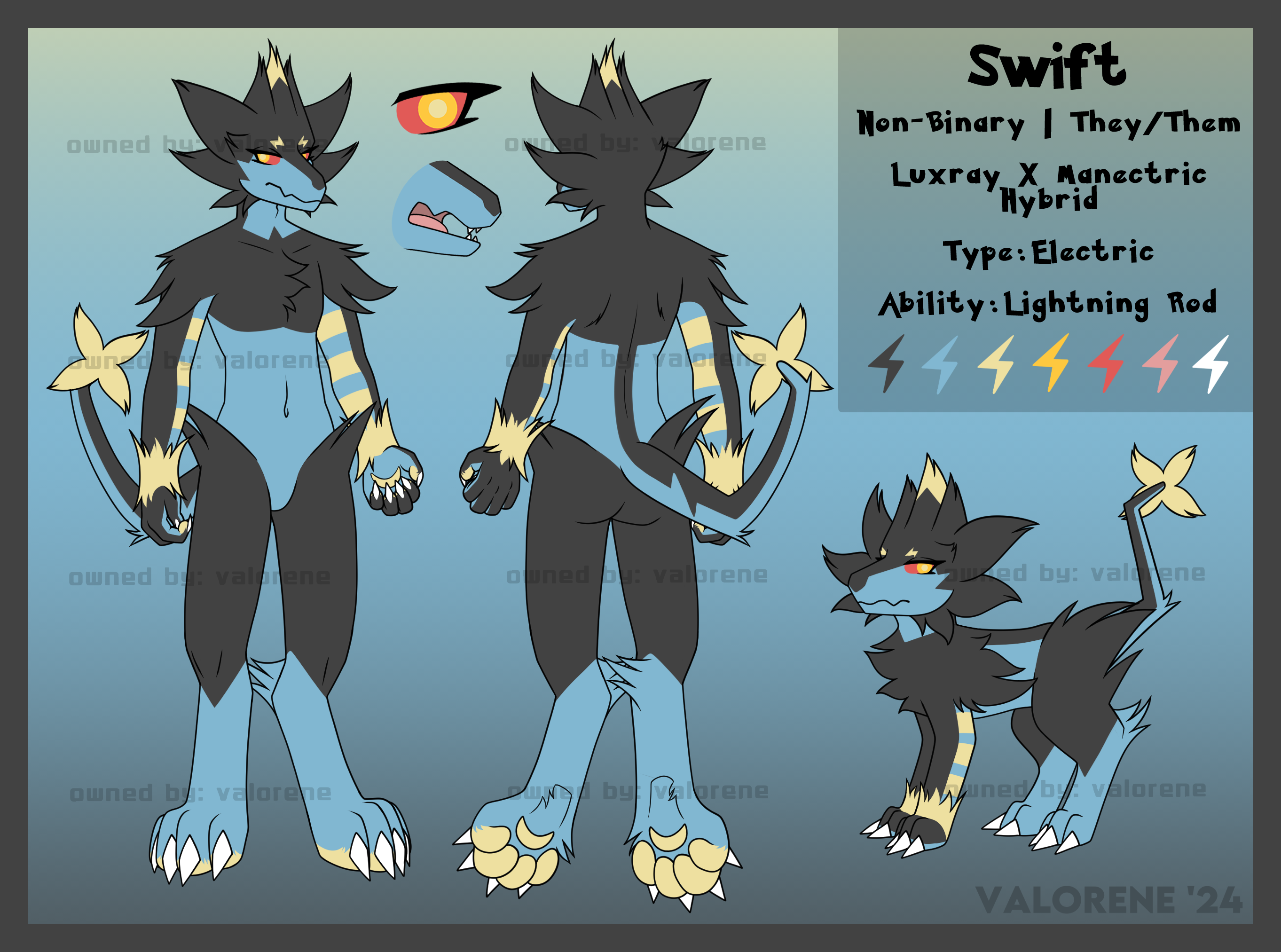 • A new personal character design! They're a Luxray × Manectric Pokémon hybrid.