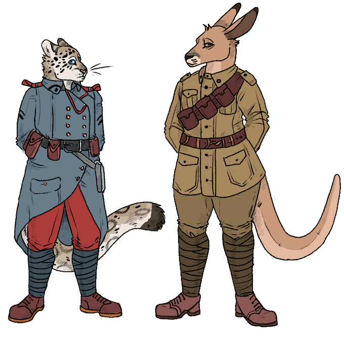 Originally drawn 11/03/21 Re-uploading this quick drawing, as you can tell from the lack of arms, of the difference in uniforms from the Peninsula Infantry (left) and W.C. Infantry (right). When the W.C. actually got funding to make their own uniforms rather than using their old Peninsula ones/or just their civvies if they were never in the army to begin with, there was a bigger focus on camouflage (this specific uniform isn't camo, obviously but it's less striking than Peninsula's blue red combo.)