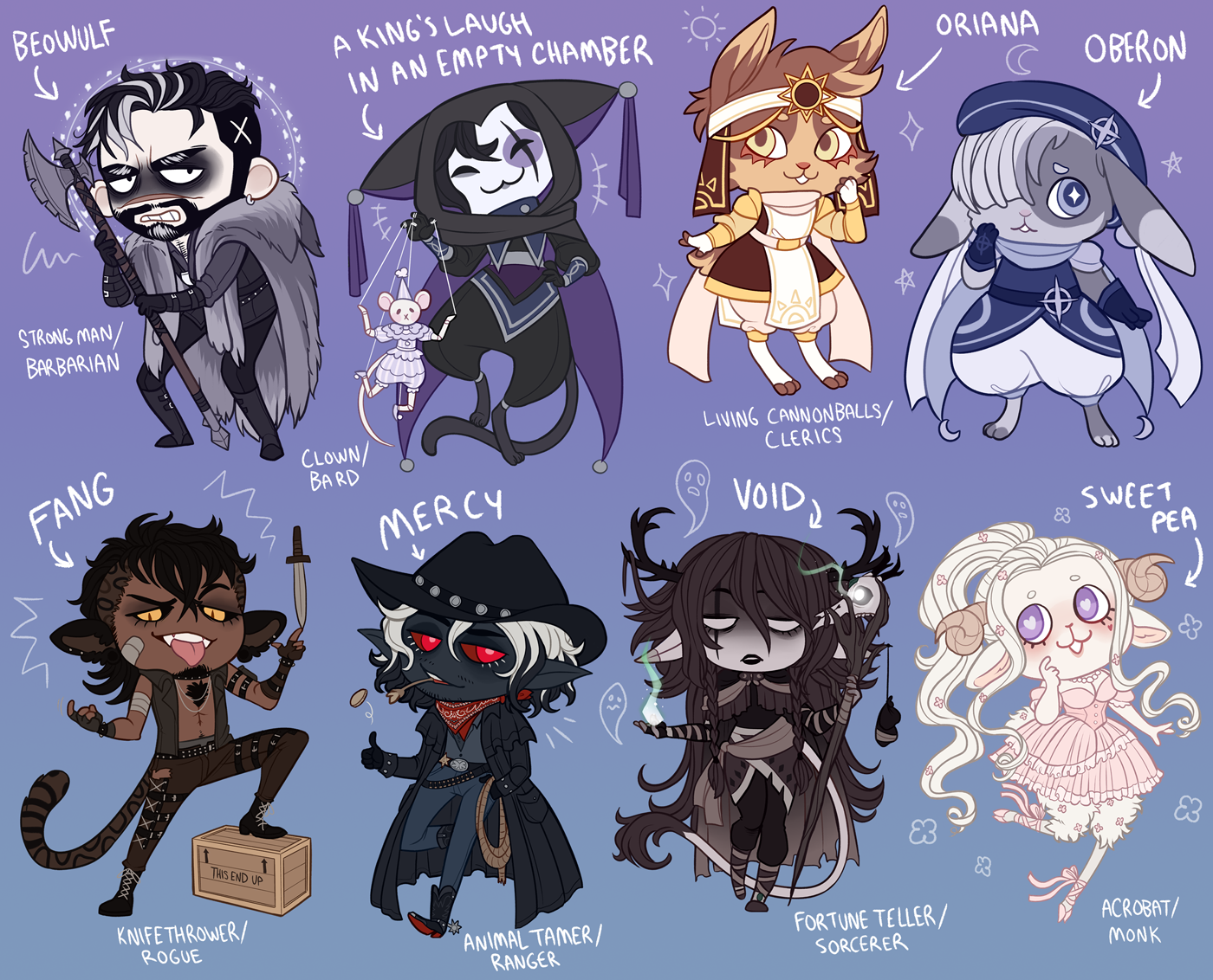 this is a dnd inspired group project between me and @cosmic-cadaver who I'll be posting a LOT of so, figured introductions were in order. a fantasy circus filled with a group of unwanted losers doing their best to make ends meet while their new boss, Godfrey Archibald Hollingsworth III, tries his best to make something out of them and force these idiots to TEAM BUILD (also also do crazy side jobs) ------ Beowulf, A King's Laugh in an Empty Chamber (or King), Oberon, and Sweet Pea are mine. Oriana, Fang, Mercy, and Void are kiwi's.