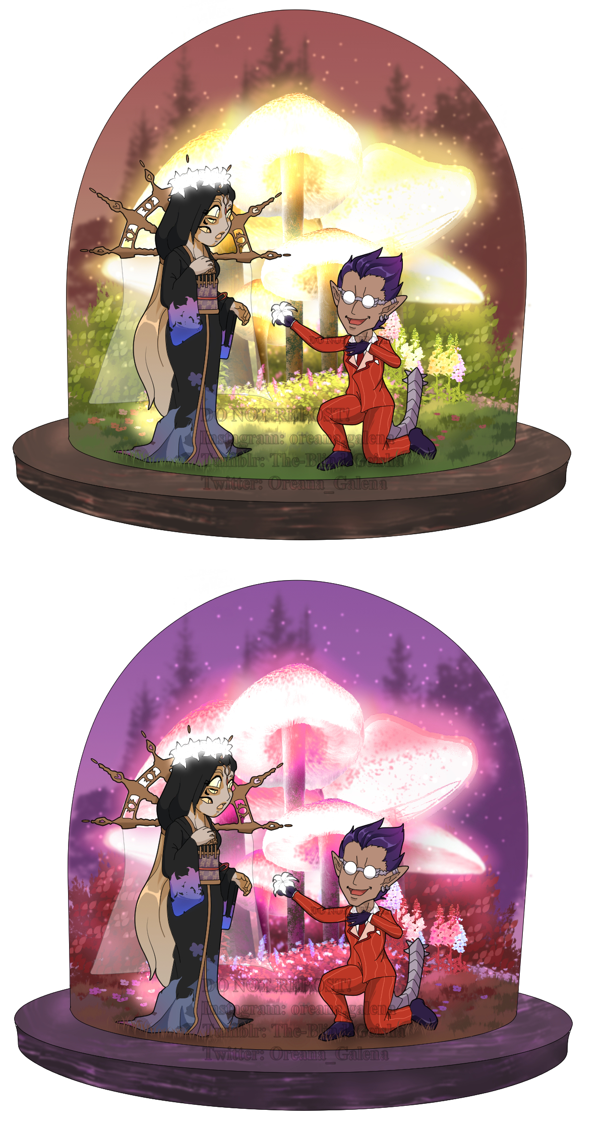 Welcome my first ever submission to this website! I am trying to branch out to other websites to see what is out there and hopefully join something cool and new for communities to build upon. This is my latest piece of work, which has reached the peak of character design for my two oldest OCs: Luna Bellum and Admira Axton. These two are part of a larger world which me and friends have been building for about 3 years, and only a small bit of lore can be placed here so I have tried to water it down to be easily acceptable, but there are LOTS of things that are missing and only a bit can be delved into at this time. [Character Lore] Luna Bellum (the one on the left) is a Death Spirit. Death spirits are intelligent living masses of unnatural material called "Void" that can shapeshift into any creature they have touched in their life. They are featureless and pitch black except for their "eyes" which glow white. They are extremely dense and feed off of heat and light as a food source, resulting in them being very cold and is the reason for their unique appearance. All death spirits come from the Void, the mysterious realm of the afterlife where their father Aoimonia resides, the god of the dead that collects the souls of passed on lifeforms and is their collective creator, to all death spirits he is their father, and all death spirits are their siblings. Luna in particular is an Elder Spirit, the first born, they were created in one large generation to fight in an ancient war against Humanity, becoming Aoimonia's personal reapers of souls to all of those stubborn enough to not let him have it. Without a soul of their own, they are vulnerable to the magic of humans, and so when Luna was separated from her siblings, she was enchanted with a special mask that when broken, completely paralyzes her until a human comes to revive her again. Seeing the usefulness of a death spirit as both a hunter and a warrior, Luna was adopted by ancient human clans and raised as one of their own. But her nature and lust for the souls of the living were too much for her to handle, and they all died by her own hands. Seeing herself indebted to humans for the rest of time, she fulfills her hunger for souls using animals, their meat given to humans, and acts as both a protector and caretaker for all that seek her help. 6000 years later, she has rarely ever ran into her fellow siblings, taking a human form permanently as a reminder of her oath and remaining as their sworn protector wherever she is needed, an immortal huntress. Admira Axton is the banished prince of the kingdom of Tempslosia. A land which has been separated from the world for over 500 years after a great betrayal and war left them weary and paranoid enough to seal themselves in their valley for the rest of history. Now in the year 2074, the world has changed, it has moved past them as humans go towards other planets, create new wonders of technology and spelltech, and just barely manage to survive the 2nd Eclipse, a terrible world-wide scale invasion by Corruption: a giant underground hivemind of acolytes to Aoimonia and his servant Vanta that seek to take over the world so that Aoimonia doesn't need to do anything ever again (soul collection is hard). As Admira's bad political skills lead to his downfall, his place on the throne has been taken by his younger brother, while Admira was sent beyond the mountains into a new world of dangers, wonders, and mysteries. Shortly after his banishment, he ran into a small strange creature, a huntress that called herself Luna. [Art and Design] These two have undergone many design changes over the years alongside my own art skills, but in their current forms I think they've reached their present peak. Luna is an almost motherlike presence that looks quite friendly, but still clearly quite cold and inhuman. Admira is more of a... questioning man, lots of vigor and stubbornness from his banishment, but still a healthy dose of caution and skepticism now that he is in a world that is not his own, a reverse-isekai. As for the image itself, this is one of the first pieces with extensive backgrounds. I am still learning and after just this one image alone I realize I can do this so much better and easier (and it can be clearly seen I draw characters better than I can do backgrounds). But it is fun and I hope to improve on it for more juicy drawings and art in the future, especially in my favorite home-grown setting me and friend have lovingly expanded since 2020 (we were bored in the pandemic).