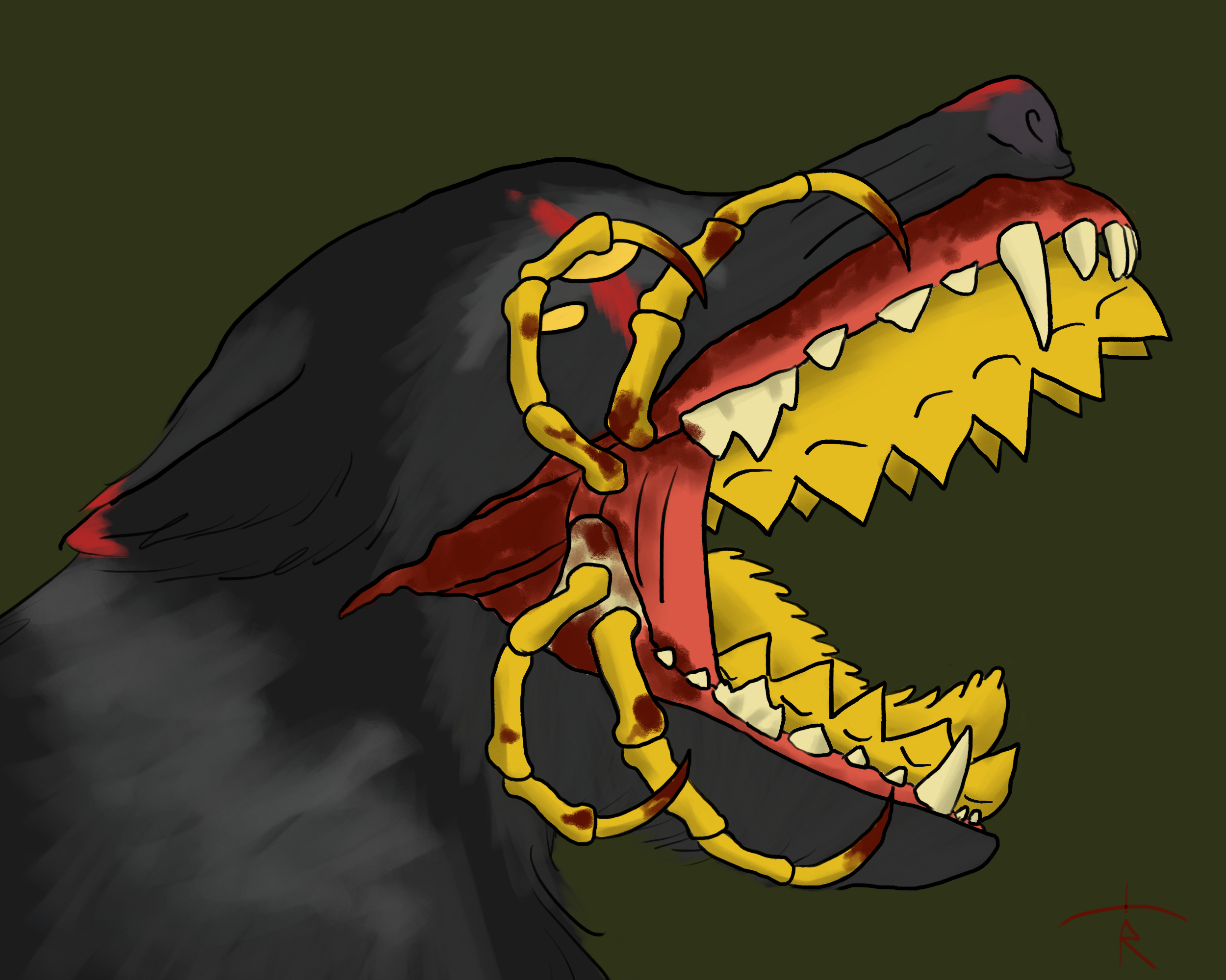 [ID: A digital painting of a grey wolflike entity with their jaws spread so wide the corner of their mouth is splitting. Inside, there's a pair of golden yellow jaws with a barbed tongue and four bony, clawed, fingerlike appendages reaching out. /ID]