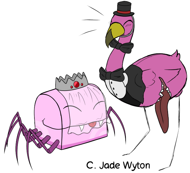 • Jewellery box mimic, Mimi Bloom, at her wedding with the lawn flamingo mimic, Don Flamingle!