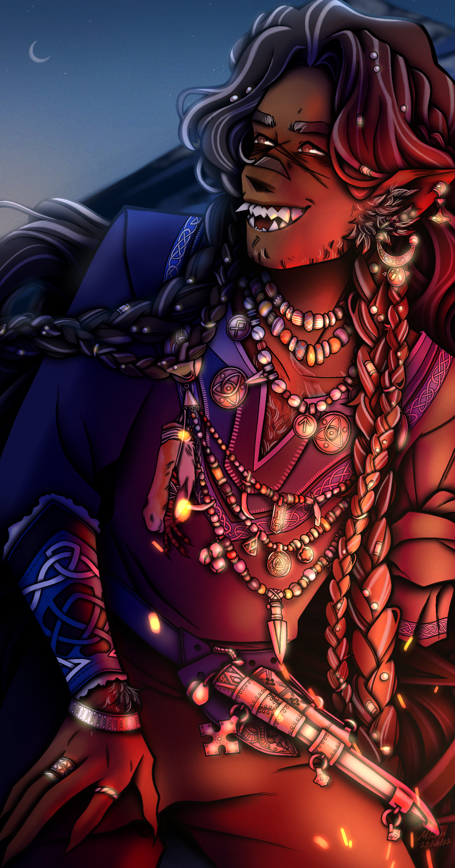 As the sun sets on this summer evening, Muse finds themself adorned in jewellery and trinkents for the first time since their journey began. They sprakle and glitz from the bonfire, that has been set up to keep them warm from the cool air of the night.