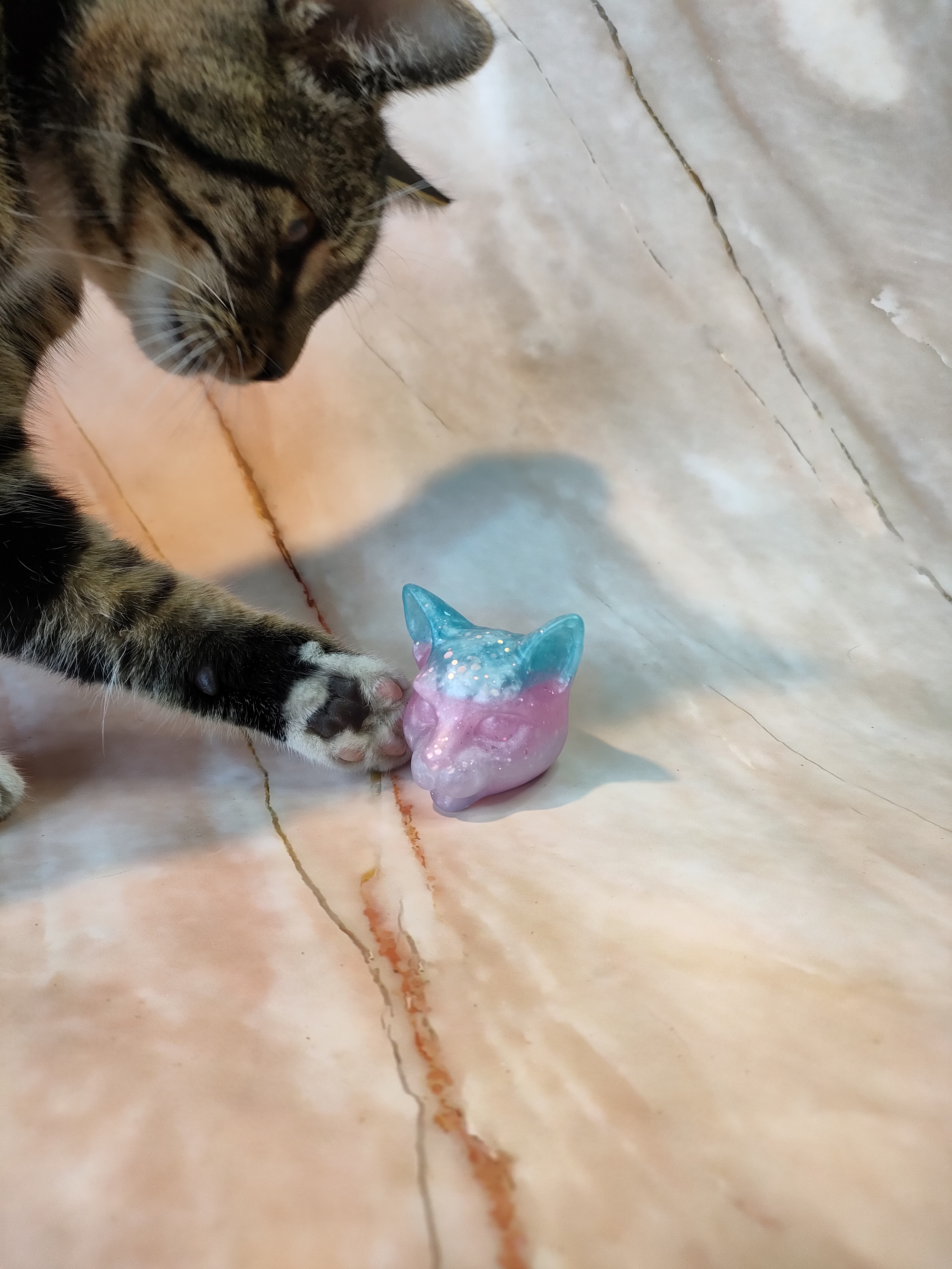 I've had this account for over a month and due to a serious medical situation I completely forgot about it but I'm finally starting to feel well enough to focus on posting. So hello! My name's **Cryptid Space Cat** or **Jay**! If it wasn't obvious by the name, my three favourite things are cryptids, space and cats! My work ranges from traditional canvas painting, resin pouring and jewellery crafting to cosplay prop making. I'll be posting a lot of my backlog for a while, interspersed with newer work as I make it. Featured in the photo is one of my cats, Taliesin or Tal, admiring a trans pride themed resin cast cat head I made a while ago. I am LGBTQIA+ myself and this is a safe space for everyone 🏳️‍🌈🏳️‍⚧️