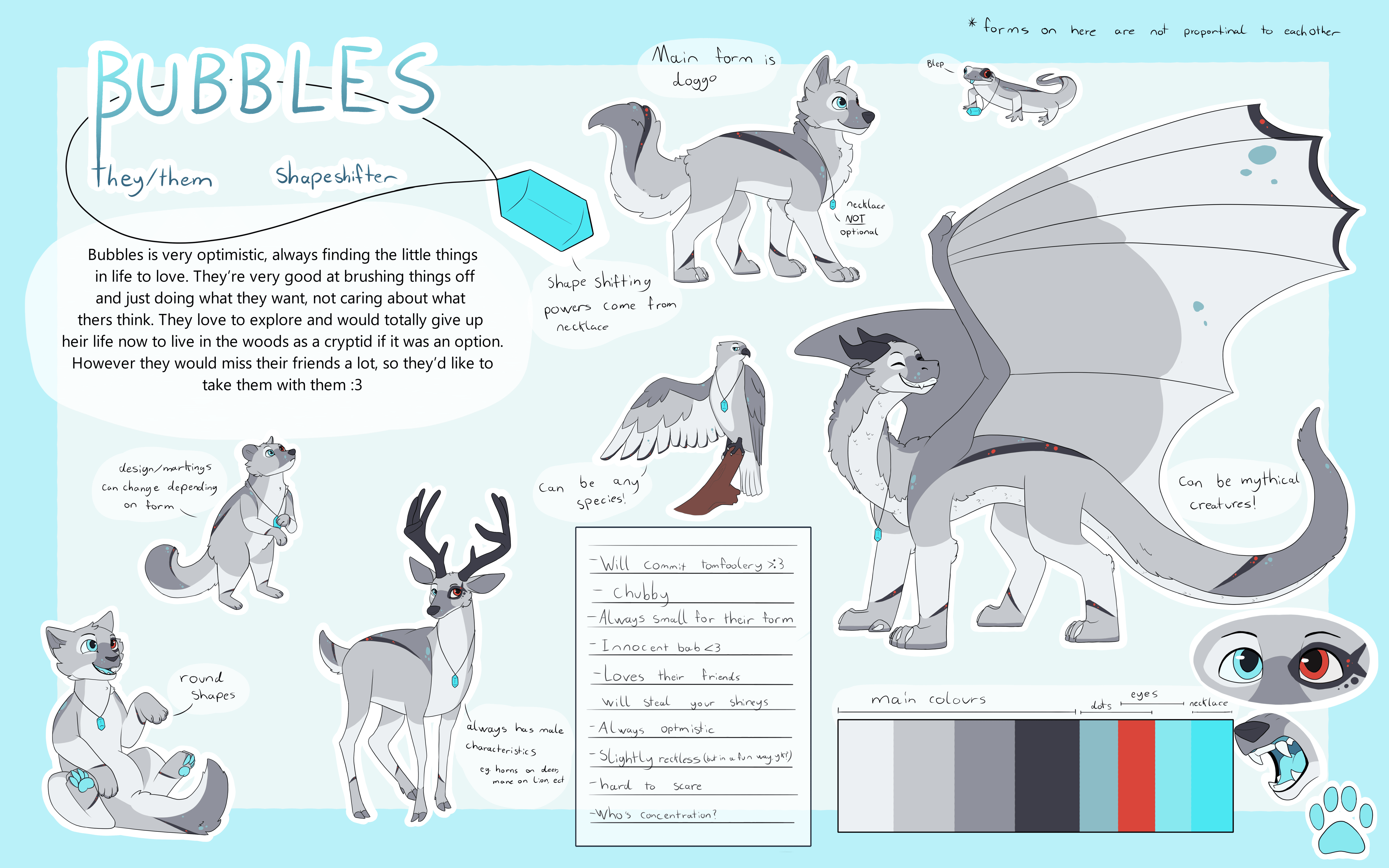 10 hours, 175 layers, and one very cramped had later, it's finally done! Now time to start their anthro/humanoid forms ref TwT ------ Main changes: - Made them a shapeshifter (not just a dog) - slight colour changes - slight pattern changes - removed some jewellery/accessories ------ Design notes: - Can be any species (including mythical creatures) - Always has male characteristics (eg. horns for deer, mane for lion, etc) - Chubby and round shapes! - The dragon on this ref isn't the only dragon form they can take (eg. they can have all scales, feathered wings, no front legs, etc) - Design/markings can change depending on form (must be recognisable tho) - Always has pupils - should always have necklace on (if they don't for one reason or another, they can only be a dog without it) ------ I've been thinking about adding more backstory for them, but for now all I have is they were once a normal doggo, then they somehow got their paws on this necklace, and now they can shapeshift! Prob won't make any of their backstory really dramatic and such, seeing as it's just meant to be a representation of me, but still! If any of you have idea on their backstory (where they came from, how they got the necklace, how/why the necklace is even magical in the first place, etc) I'd love to hear ^^ ------ Character © Fl0atingBubbles Art © Fl0atingBubbles