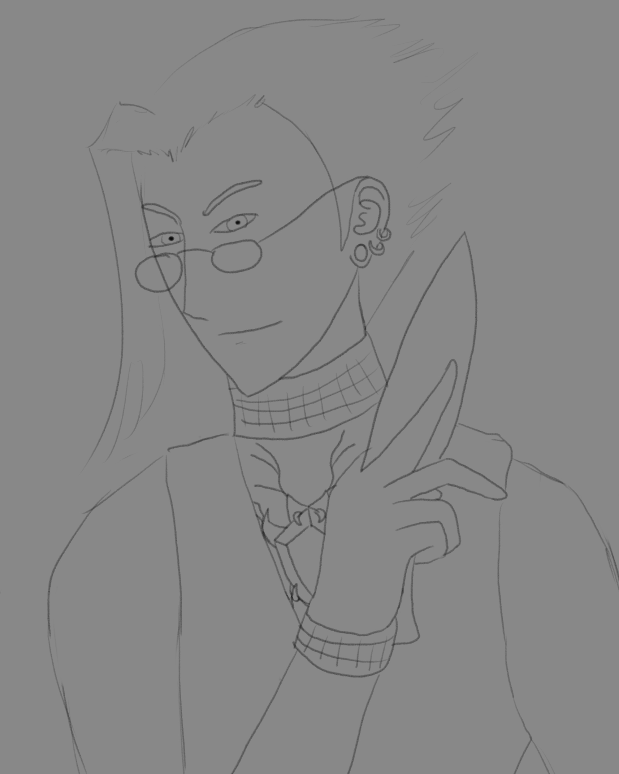 Sketch of goth Yeager. Yeah I got nothing lol. Not terrible. Day 2: goth [ID: A digital sketch of Yeager from Tales of Vesperia dressed as a goth. He's wearing small sunglasses, a vest with nothing underneath, a collar, a wide bracelet, and he's got three piercings in his visible ear. He's also holding up a knife. /ID]
