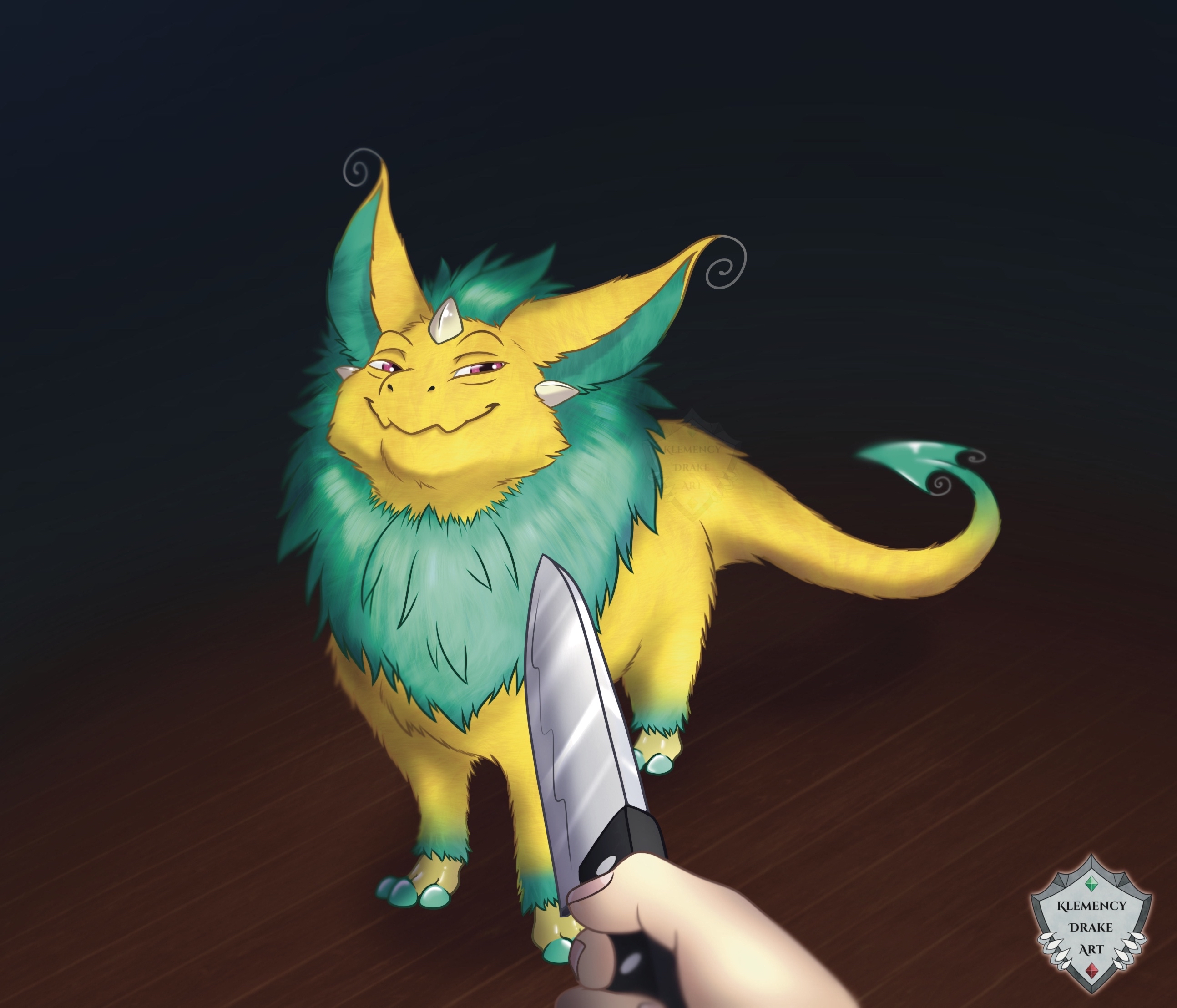 • My creature OC, Dexter, as that one cat meme with the knife. Iconic.
