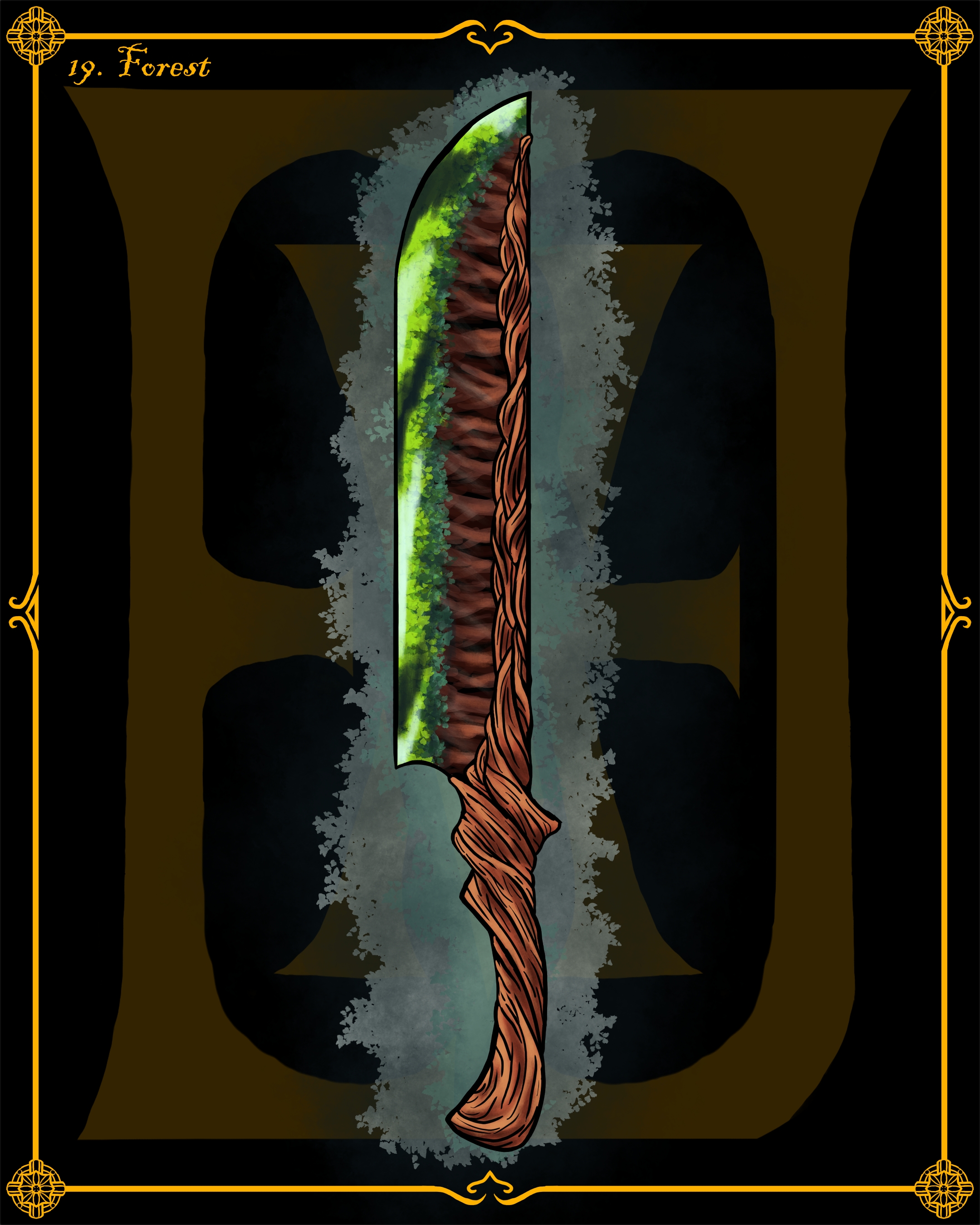Today's prompt is Forest, and I got struck with the idea of a sword with the forest canopy as the blade's edge, and the tree trunks in-between. Could've probably made it a wee bit longer, it just looks kinda like a kitchen knife here, but I still like how it turned out.