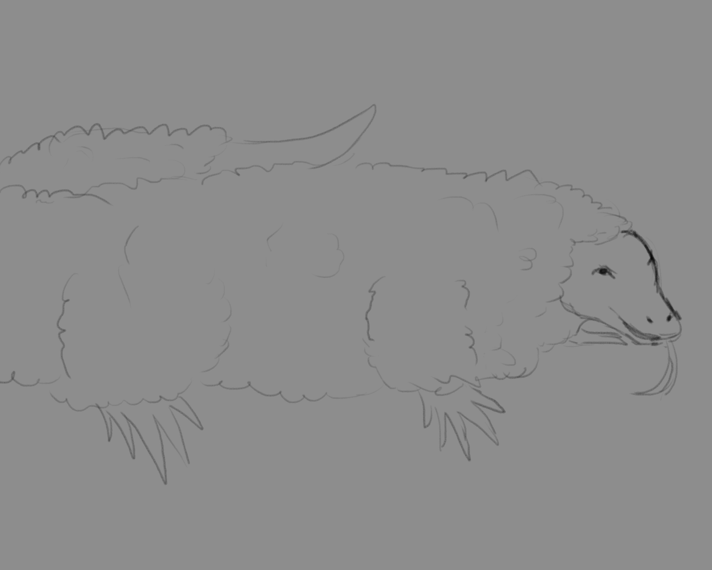 I was trying to think of another subject for a sketch and all my brain was giving me was 'fluffy lizard', so here y'all go. [ID:A digital sketch of a komodo dragon with wool sprouting from everywhere but its feet, head, and the end of its tail.