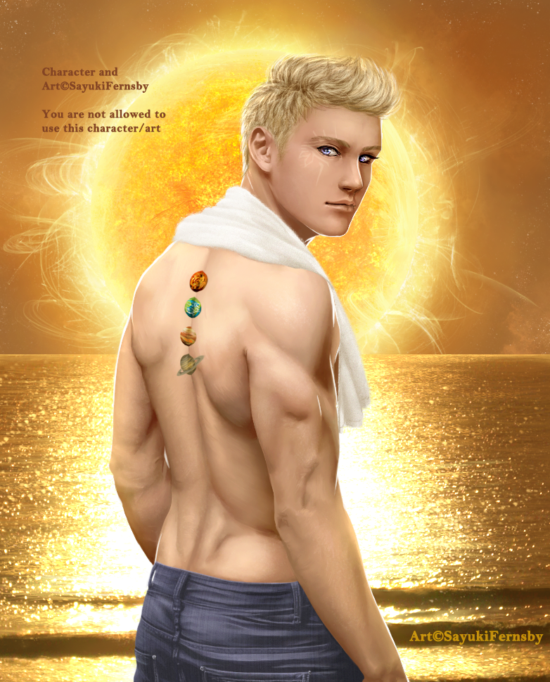 And it's time for my next reupload: This time the drawing is from July 2018 and shows one of my OCs: Solis <3 I really like him and he is accompaning me since many years already. He may looks like one of this sunny-boys, who have nothing more in their brains than muscles, parties and girls, but this impression is deceptive. Yes, it is true: he loves to exercise, is proud of his body and usually shines and laughs like the sun (Sol), he is named after, but this is only one side of him. Solis is kind of a mathematical genius and a astrology-expert. His open-minded and friendly character makes it easy to go along with him and himself to one of my most uncomplicated characters. --- To the picture: I did not only want to draw Solis' (back then) new look, but also wanted to study the male anatomy. This means that I used a reference for his body posture (not for his face). It was a great experience and I learned a lot about muscles and skin texture. --- You are not allowed to use/steal/copy this picture, the character or his look or use my artwork to train AI. Thank you very much. Artwork and Solis©SayukiFernsby