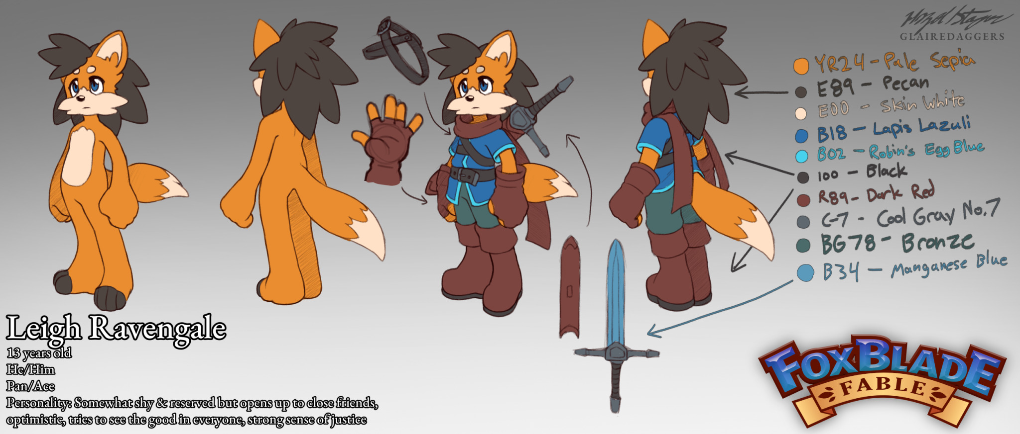 New ref sheet for Leigh Ravengale, the protagonist of Foxblade Fable (a game I'm working on!)