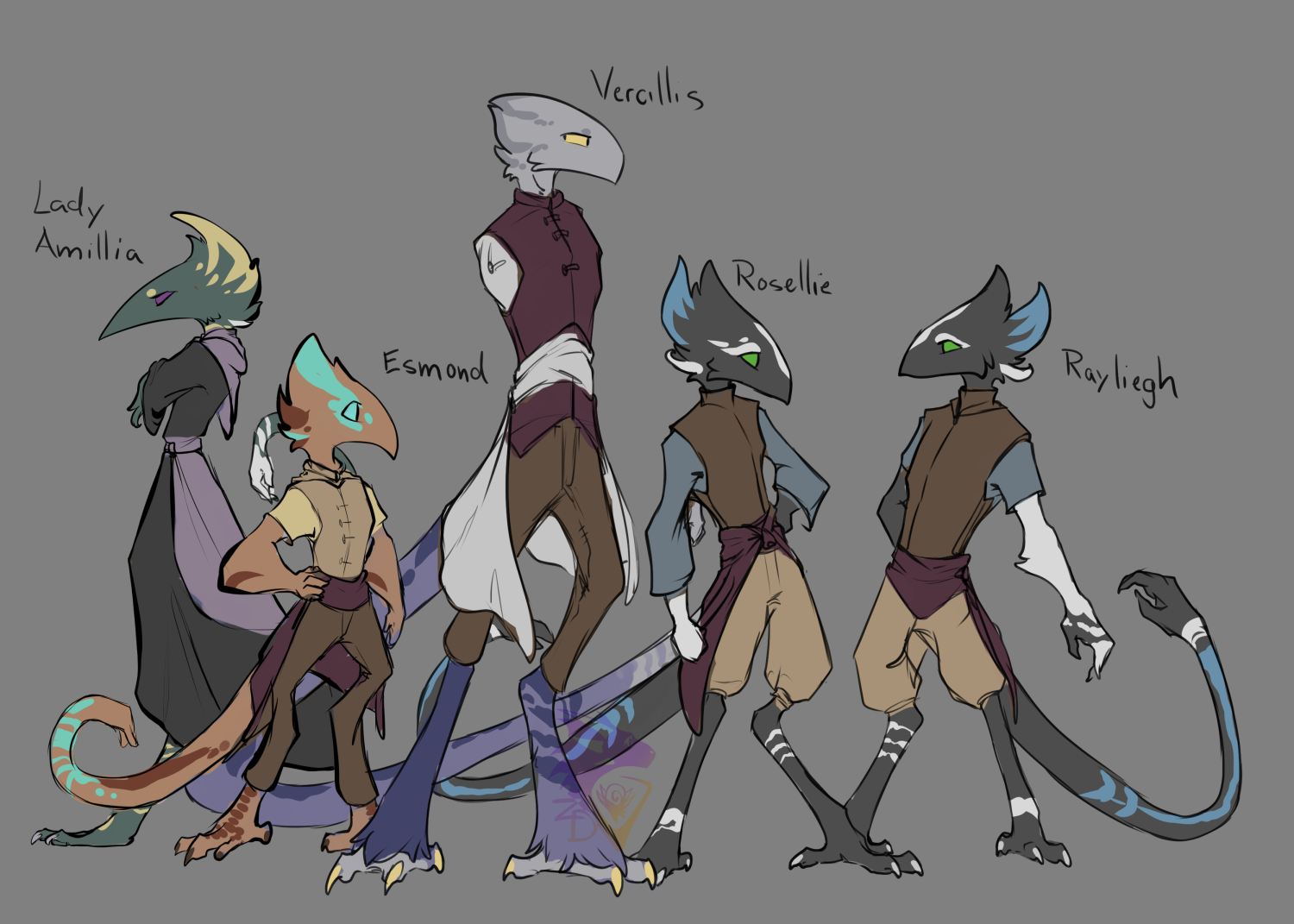 A rough line up of my current cast of headworld ocs, this was done a few months ago and some tweaks have been made since then. ```Vercillis``` Leader of this group of mages-excluding Lady Amilla- Vercillis considers his squad his highest priority. Be it their opportunities for learning or ambitions they may have, while also hoping to share with them his own desire to seek those who need their help where others cannot reach them. He works hard and duitiful to uphold his position as an Illumn, despite some unique challenges he struggles with daily. Vercillis was born without his arms, and has grown an above average ability with his telepathy and telekenisis to compinsate. ```Esmond``` The youngest of the group, Esmond is enthusastic and eager to learn having entered the Mages Order through the help of Vercillis. The Illumn captian is Esmond's childhood hero, and he always seeking oppurtunities to learn from him and prove himself as a mage. He is creative, as well as compasionate though often overwelms himself with his won ambitions. ```Rayleigh``` Focused and rash Ray can come across as rude or uncaring to some, it doesn't help that he enjoys the odd prank now and then either. However he is devoted to his connections and those he holds dear. ```Roselie``` The humbal balance to her 'wayward' brother Rose is the ancher of the two. Duitiful but quiet unless otherwise required, she likes to study a situation before acting. ```Lady Amillia``` The Lady has her own crew, currently consisting of herself and her apprentice(tbd). Amillia is the eldest daughter of a noble family, and seeks higher position in the Order. However currently Vercillis hold's the title and position she desires and for that she buts heads with him regularly. Raised strictly by her father, Amillia struggles to understand how Vercillis rose to his position being a disabled commoner. ***These characters are still being developed, they are subject to alter and change as I draw them~***