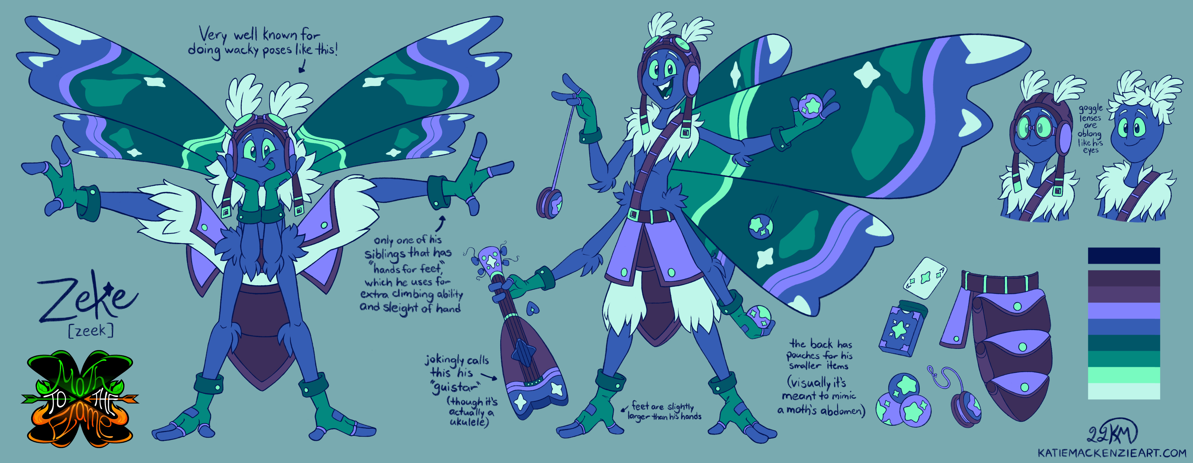 **Originally Created On:** September 4th, 2022 Another updated reference for the MttF crew, Zeke! The resident goofball and entertainer of the group. Zander and Zeke are technically twins (though Zander is slightly older in terms of his hatch time) so they’re usually up to hijinks together more often than not. Though these characters and their posing are already hard to balance with six limbs and wings as it is, I deliberately made Zeke’s main pose more complicated to show off his multitasking skills with his various props.