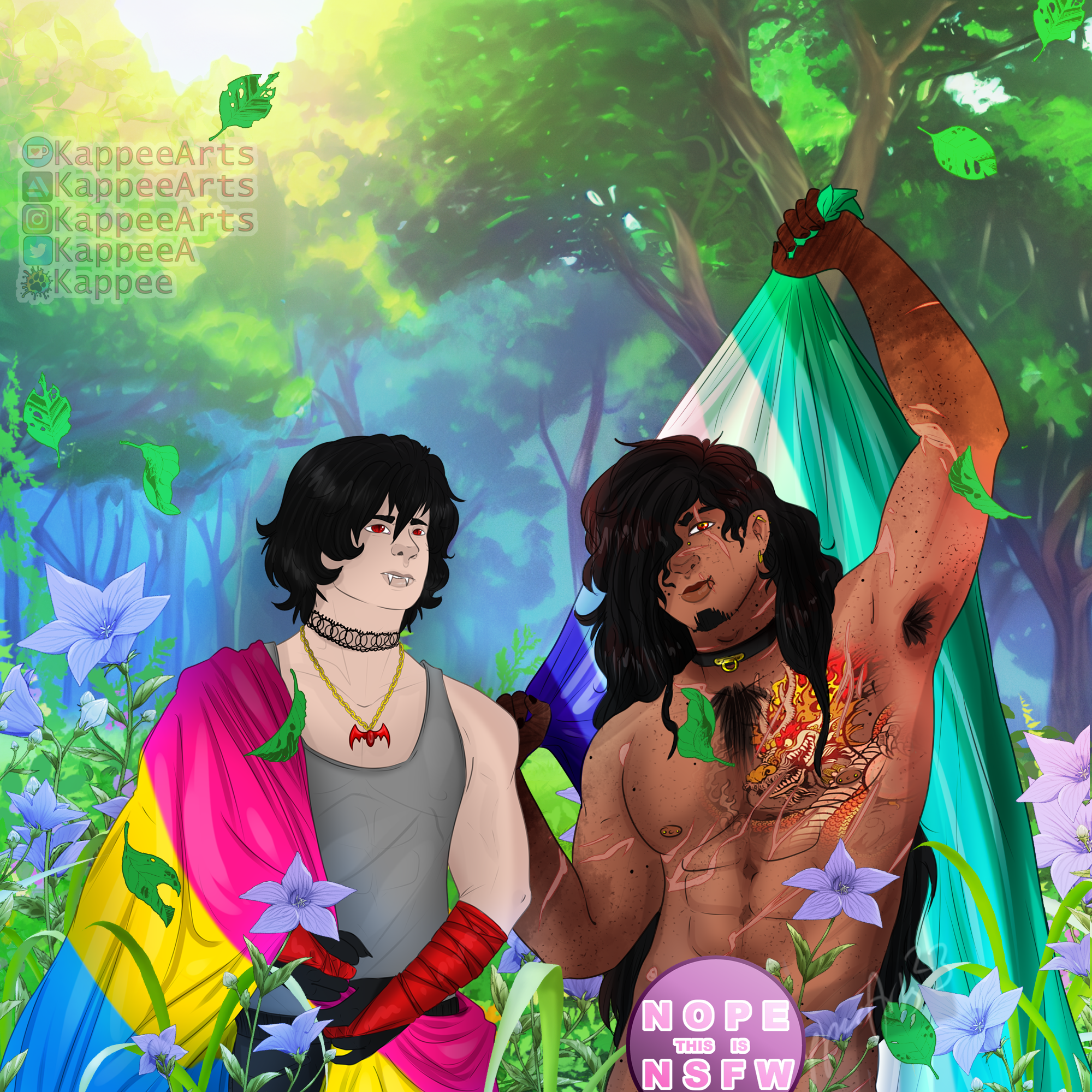 This is a ych ordered by and exclusively for DreamAngelFlight On Discord! <3 Love My bestie so friggin much, just look at their oc with mine!!!! <3 Want art like this of your own? Check out My Commissions and YCHs! \o/ #men #male #gay #couple #pride #lgbtqia #pan #mlm #ych #flag #art #digitalart Uncensored version on my patreon: https://www.patreon.com/kappeearts