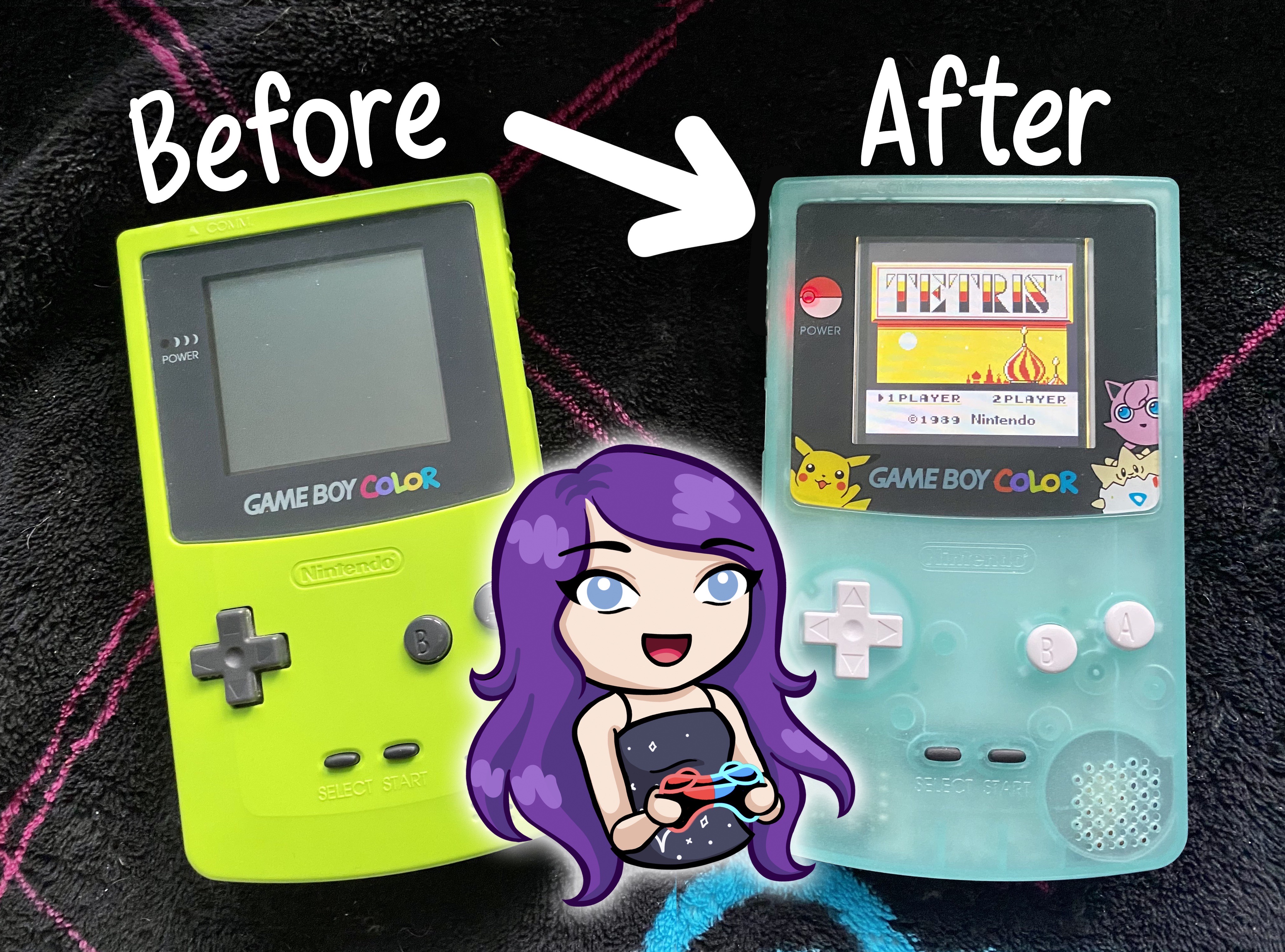 About this time last year (❗️) I learned not all console modification requires special tools & expert knowledge. So with a “drop-in” backlit screen from RetroModding.com & a glow-in-the-dark shell kit, I gave my GameBoy Color a makeover!