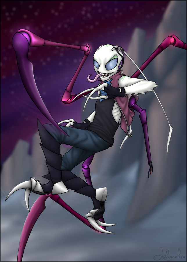 Bio: Ren was declared defective and disposed of as a smeet, unlike most others he managed to survive the process. If a smeet doesn't die in the ejection process they typically die quickly soon after of exposure from where they're dumped in a secluded crater on the surface of Irk. Ren's unique colouring is what saved him as he caught the attention of a marauder ship, who's captain took him with the intention of selling him for a profit. He spent most of his early life in captivity, however did eventually escape his captors to end up on his own where his inbuilt ability in engineering kept him alive, upgrading his own pak with parts of other irken paks as he grew. He's leucistic, which is what causes his white colouring but also results in him being completely deaf, however he works around his disability with a device he made attached to his antenna, which works by picking up speech and changing it to data that can be read by his pak. The device only works as well as most standard voice to text applications however, meaning it often mistranslates what was said. He's very skittish and feral with little to no knowledge on how to interact with others including his own kind, he holds no loyalty to the Irken Empire though he also doesn't side with any resistance effort against them, mostly just trying to survive on the fringe of a battle he doesnt want to be involved with.