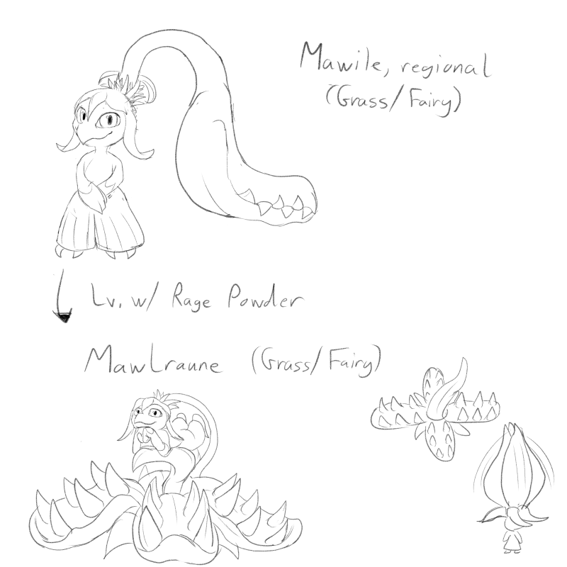 My fakedex upload reminded me that I had a regional mawile concept, but I couldn't find the sketch anywhere. I decided to remake the sketch anyway. Mawile got screwed over by only having a mega evolution that was ditched, so a regional one would be ideal.