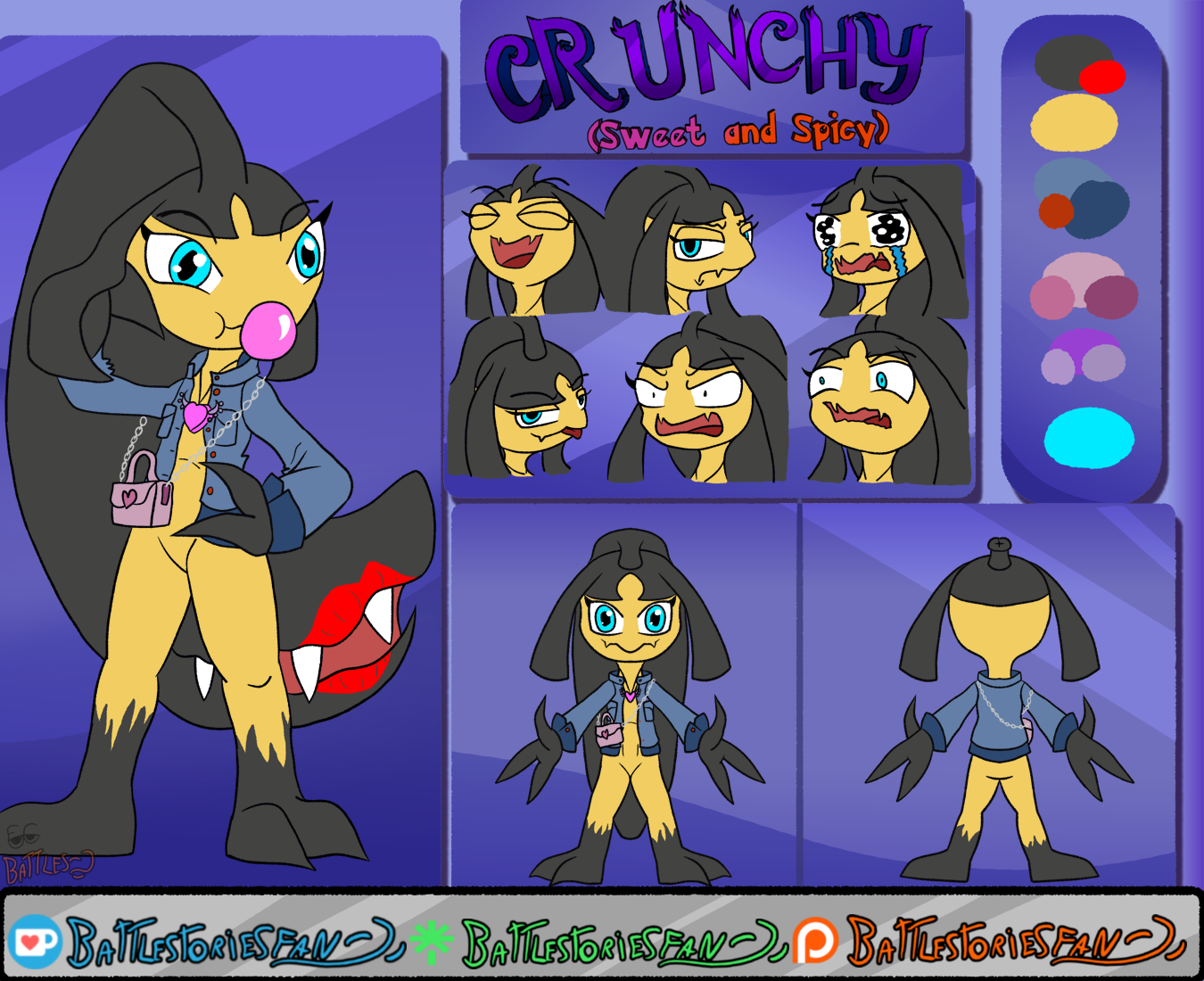 EARLY ACCESS, ORIGINAL RESOLUTION, ALTERNATIVE RENDERS AND TIMELAPSE ON SUPPORT PAGES Ref Sheet backer reward for someone on discord! Specifically, a flat color reward, a reference sheet of his mawile character Crunchy. I gotta admit, it feels REALLY odd and somewhat nostalgic to draw a mawile character again, given it's been years since i changed my character Mary from a mawile to an original species. It almost felt like drawing her again. This was done in around 4 hours almost entirely in krita, with the text being the only thing I did in blender! Enjoy, ya weird salamanders. More of my stuff can be found here!  https://linktr.ee/battlestoriesfan And if you want to have your character given a ref sheet as well, my commissions are open!