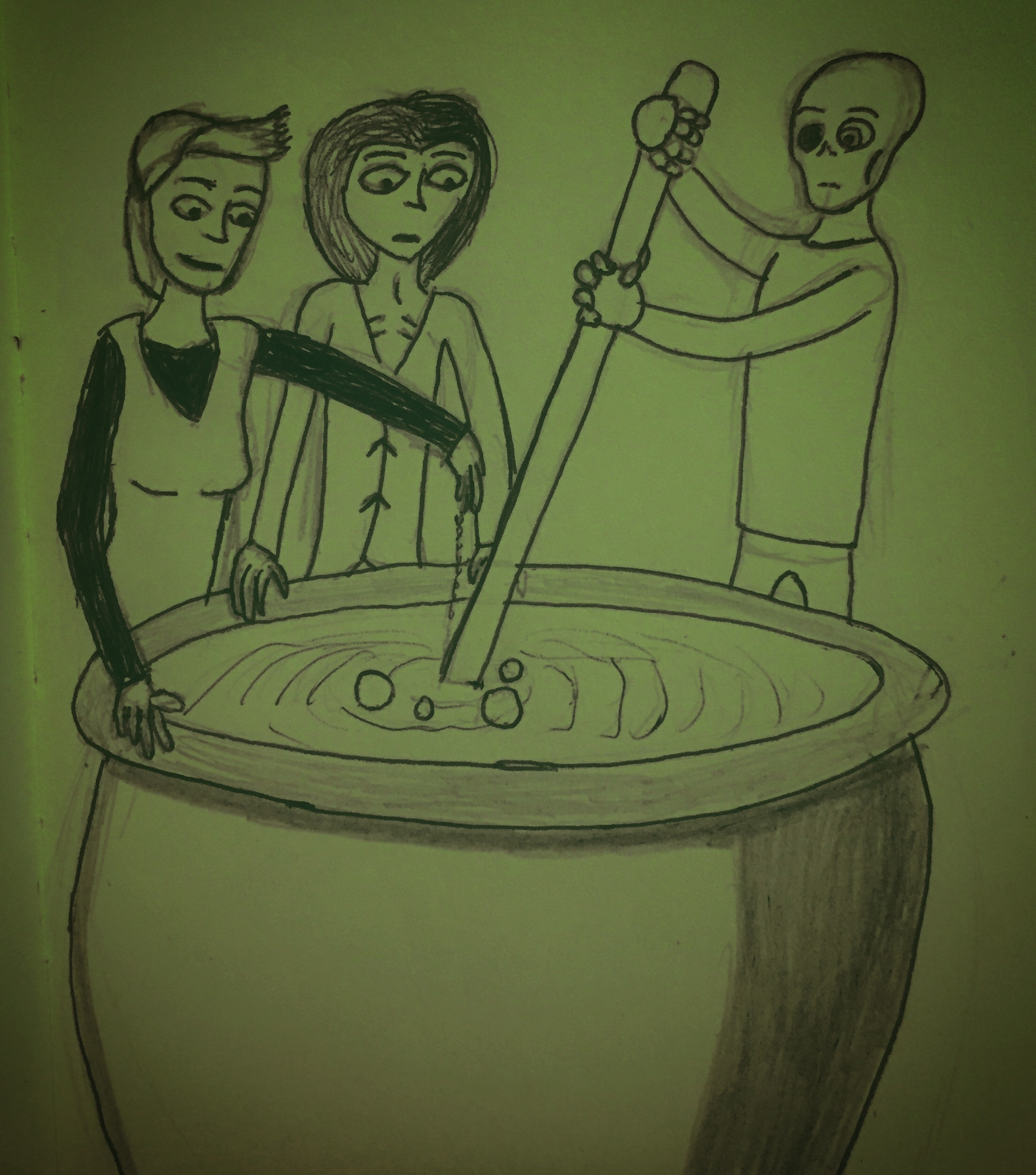 Silas assisting another partner, Drusilla the Witch and her undead familiar (and Silas’ metamour) Keir. Originally drawn October 13 2022