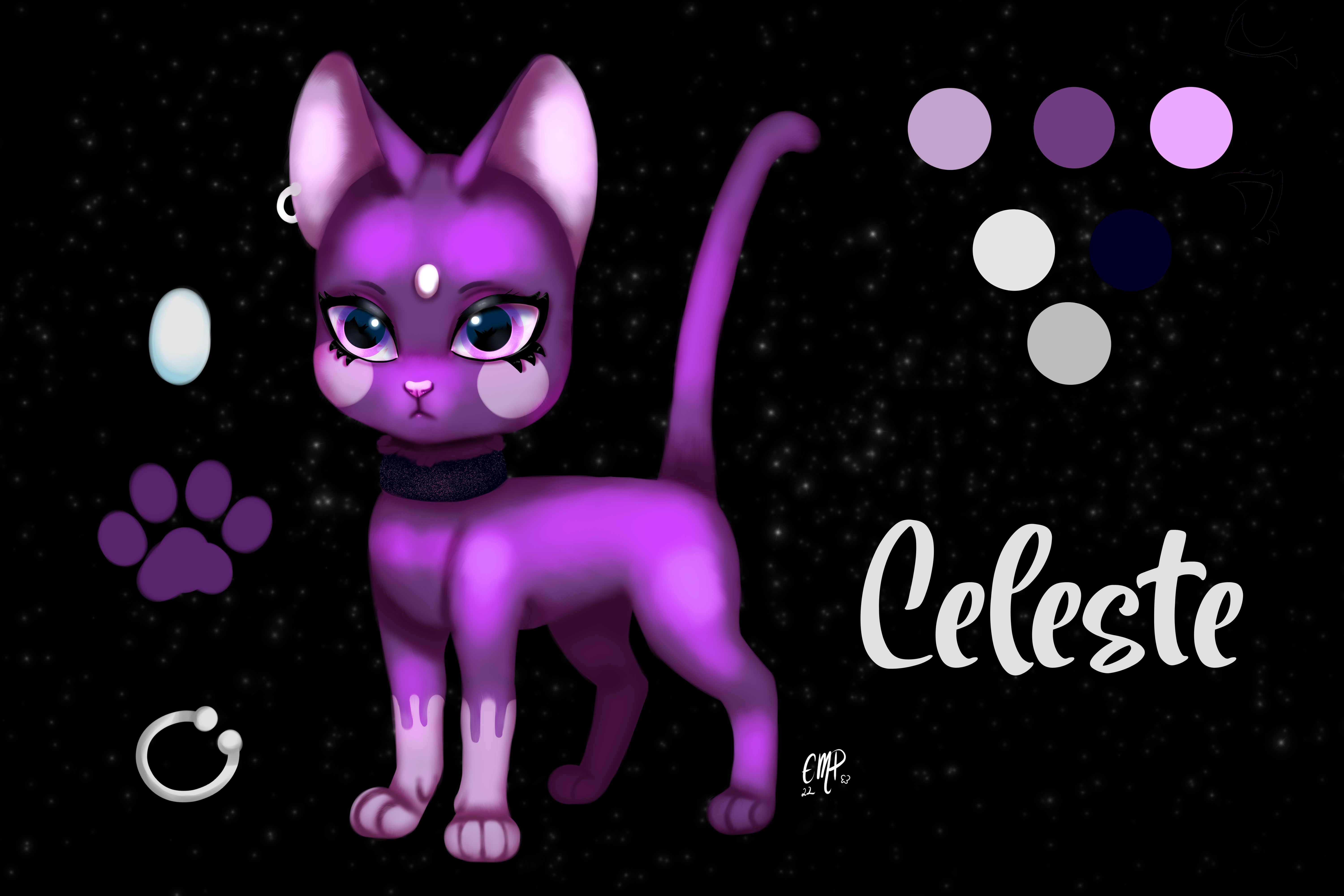 Celeste's ref sheet is done! I'm super happy with everything, I like the pose and the shading and she has now more personality. About her story : * -She's a semi artificial companion cat, designed and created in a laboratory.But she's unique, her design was done specifically for my other character, Kuiper, a galaxy princess. * -She's trained for fight and protect her princess at all costs, is serious, quiet, don't like jokes and have a special adversity for dogs(except for Kuiper) * -She's super strong but in the bottom of her heart, she enjoys a lot to observe a meteor shower with Kuiper, who is so kind and sweet with her. * -She's able to has feelings but prefers to hide them. * -The gem on her forehead keeps her alive. * -Is like a big sister to Kuiper and takes care of her (normally a total mess) * -She has a strong sense of justice. * -Is trying to find herself.