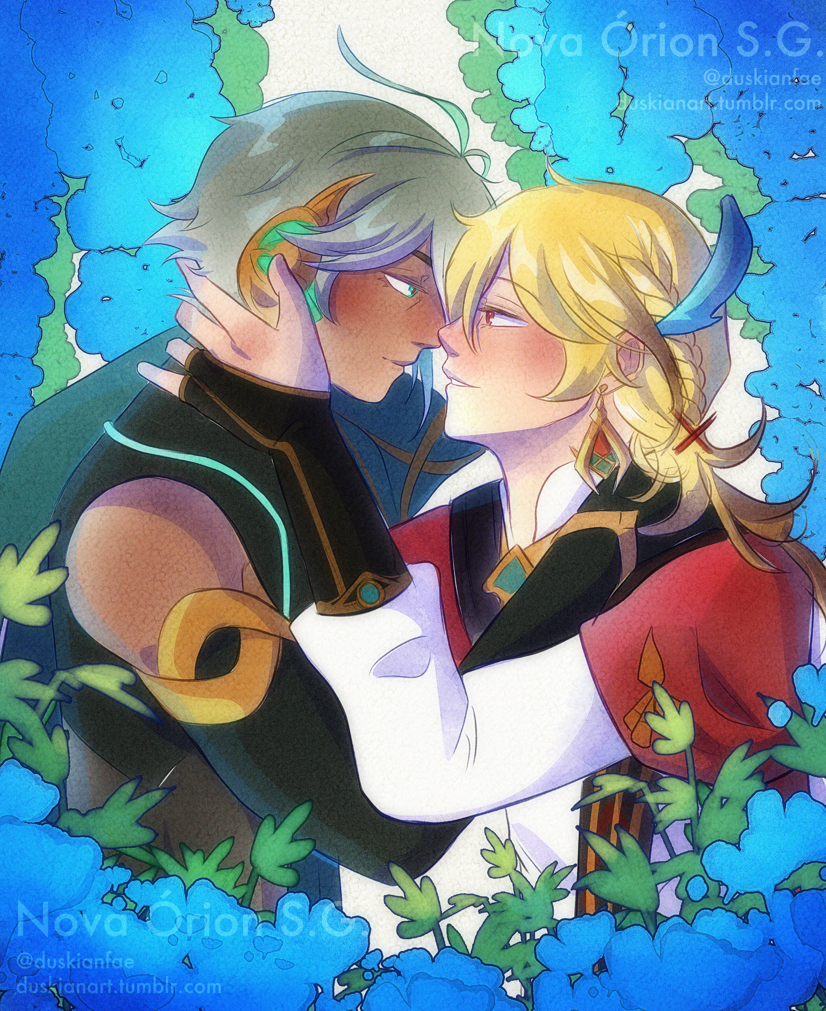 My contribution to a brazilian pride event on twitter! I got the achillean/mlm day, so I draw Alhaitham and Kaveh because I love them so much! I had to rush it a bit because I was foccused on work, so I couldn't make it as elaborate as what I had in mind, but I still really like how it came out!