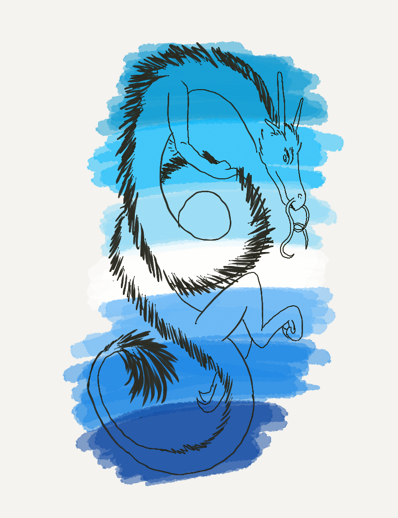 [ID: A digital lineart of a dragon painted with the colors of the MLM flag. /ID]