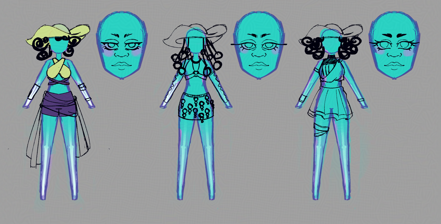 [Picture ID/ Three sketches of Jayla Cephidae to test a Hades-style ensemble. Each variation wears a wide-brimmed hat, resembling the shape of a fried egg. Her body is semi-transparent with the bones showing. The first outfit has a wrap halter, shorts with cloth wrapped around, and really curly braids. The second outfit has braids that end in giant rings, a halter tied with a ring between the breasts, and a miniskirt with rings adorning it. The last outfit is a short chiton with ribbed underclothing. /ID End]