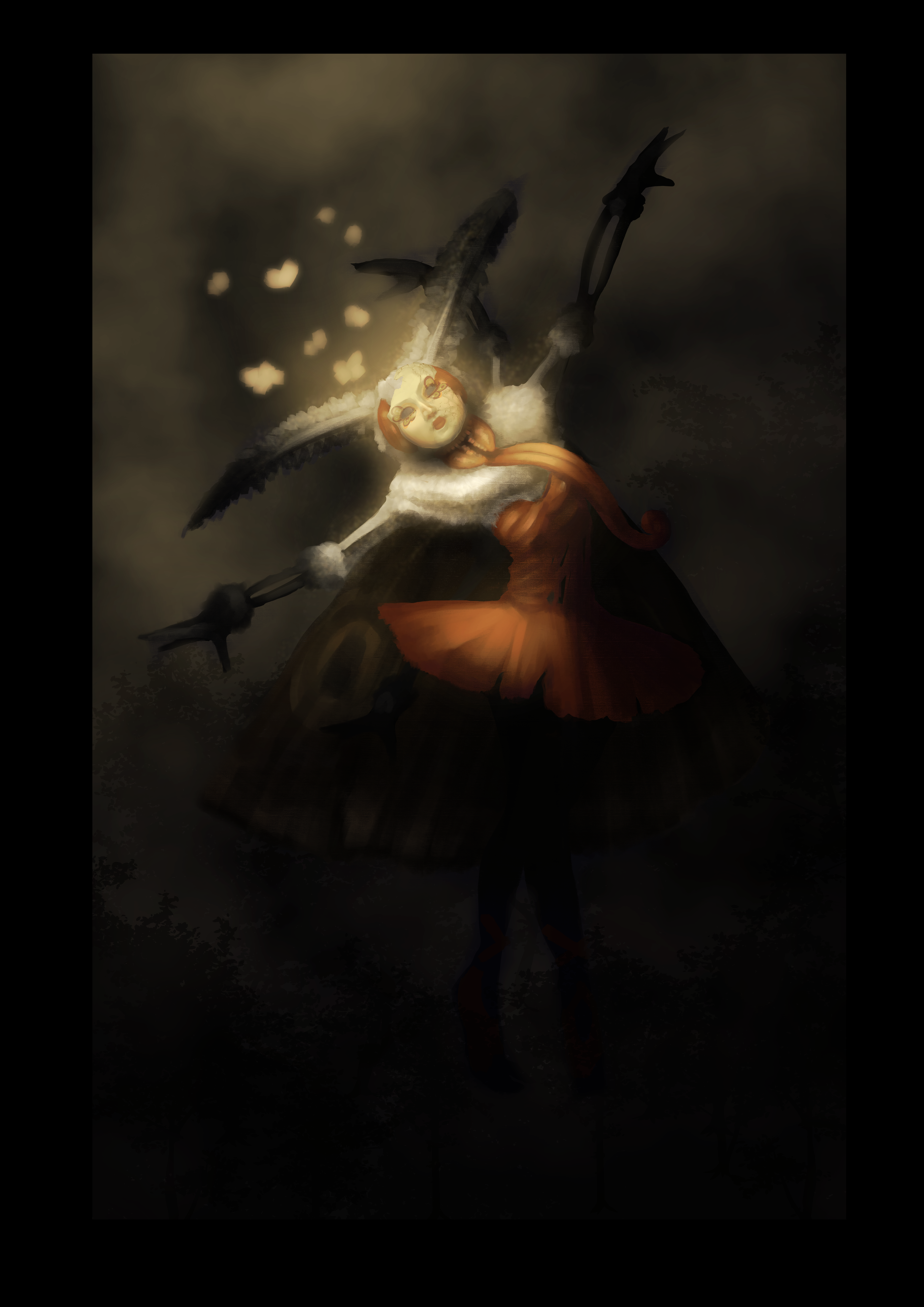 Painting 1/3 in progress! Crypid Beauty The mothmother, my take on the famous Mothman crypid. This creature was a parasite born inside a ballerina, eventually taking over the body as it's vassel. It dances without reason, the muscle memory and desires of the now corrupted mind of the Ballerina still craving the challenge and thrill of practicing and performing. -- Painting 2 - Elegance in Eldritch - Eldritch themed Painting 3 - Fear in the Forest - A hybrid of the Saskwatch and Wend*ngo Super enjoying these! Hoping to turn them into posters to sell. Constructive feedback and critique always welcome!