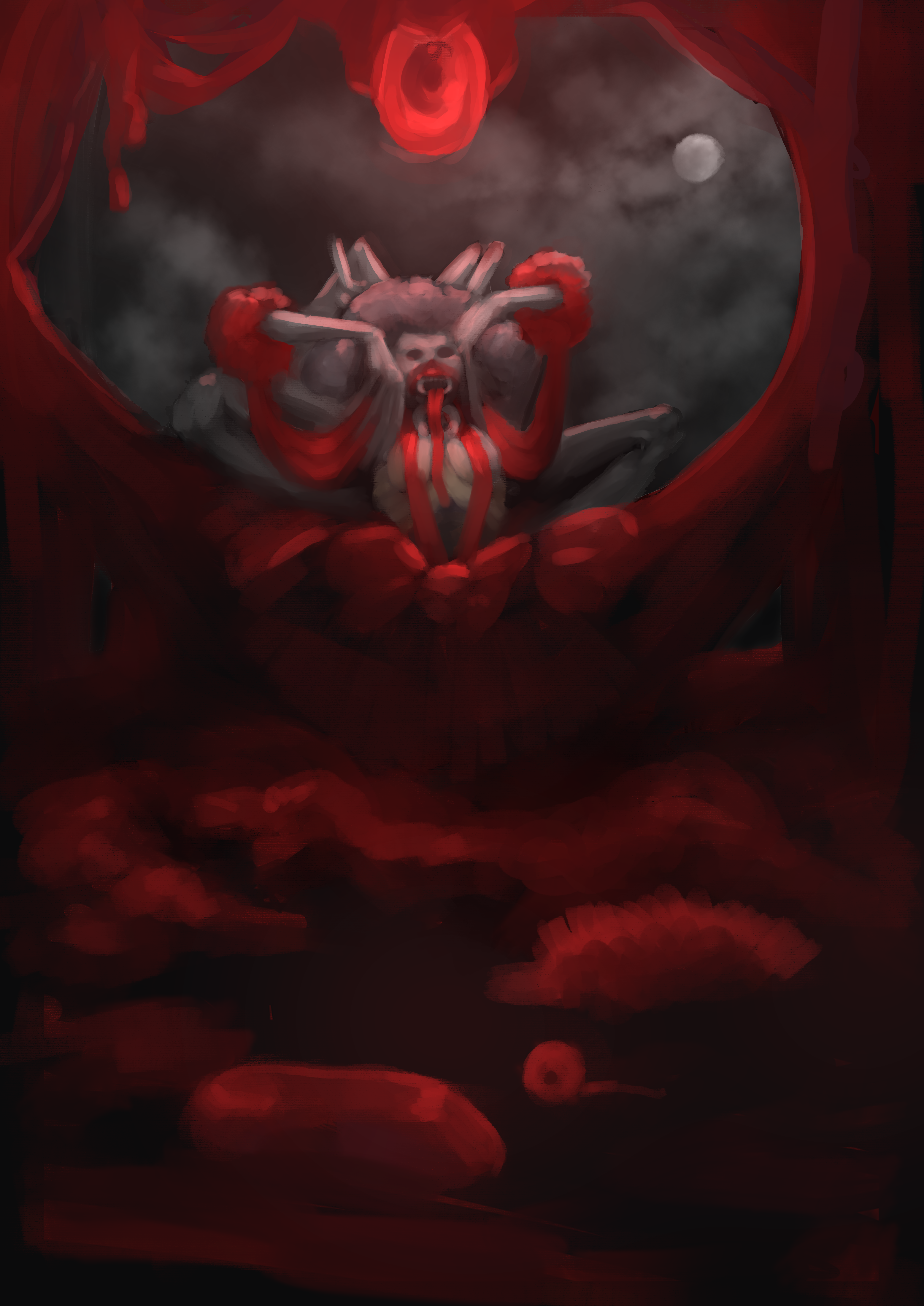 A fun experiment! I was very happy with how this one turned out. Originally, I had drawn this one months back then decided to come back to it with a new technique. As a passionate artist, there is a hunger to experiment and find the right technique to match my vision. When an experiment comes out as something cohesive, its always satisfying! -- The Ballerina inside drives the Mothmother's cravings, accidentally steering the dark hunger towards her previous colleges. Their outfits and visera spread around the hammock of silk, a strange familiarity comforting the Nesting Mother. Deep inside an abandoned church, facing an iconic lighthouse, the Mothmother spins her Gore Nest, incubating the next generation of Mothman.
