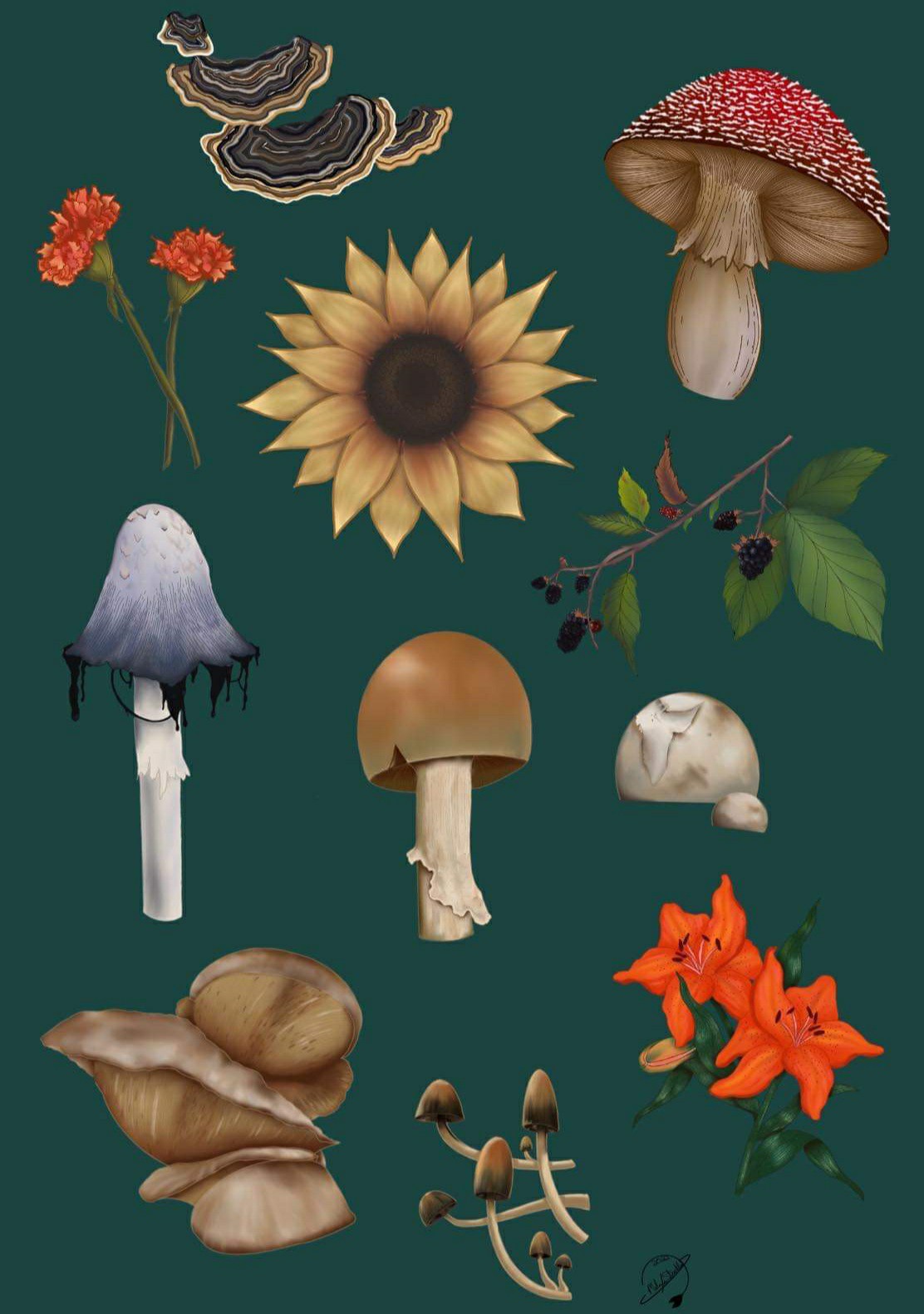 • I did another round of things found in the forest. I really enjoy drawing mushrooms and florals lmao. I'll more than likely do more, but I know that we're turning a lot of what I design into stickers. I'll be putting these bad boys in my renfaire book for my little druid/alchemist