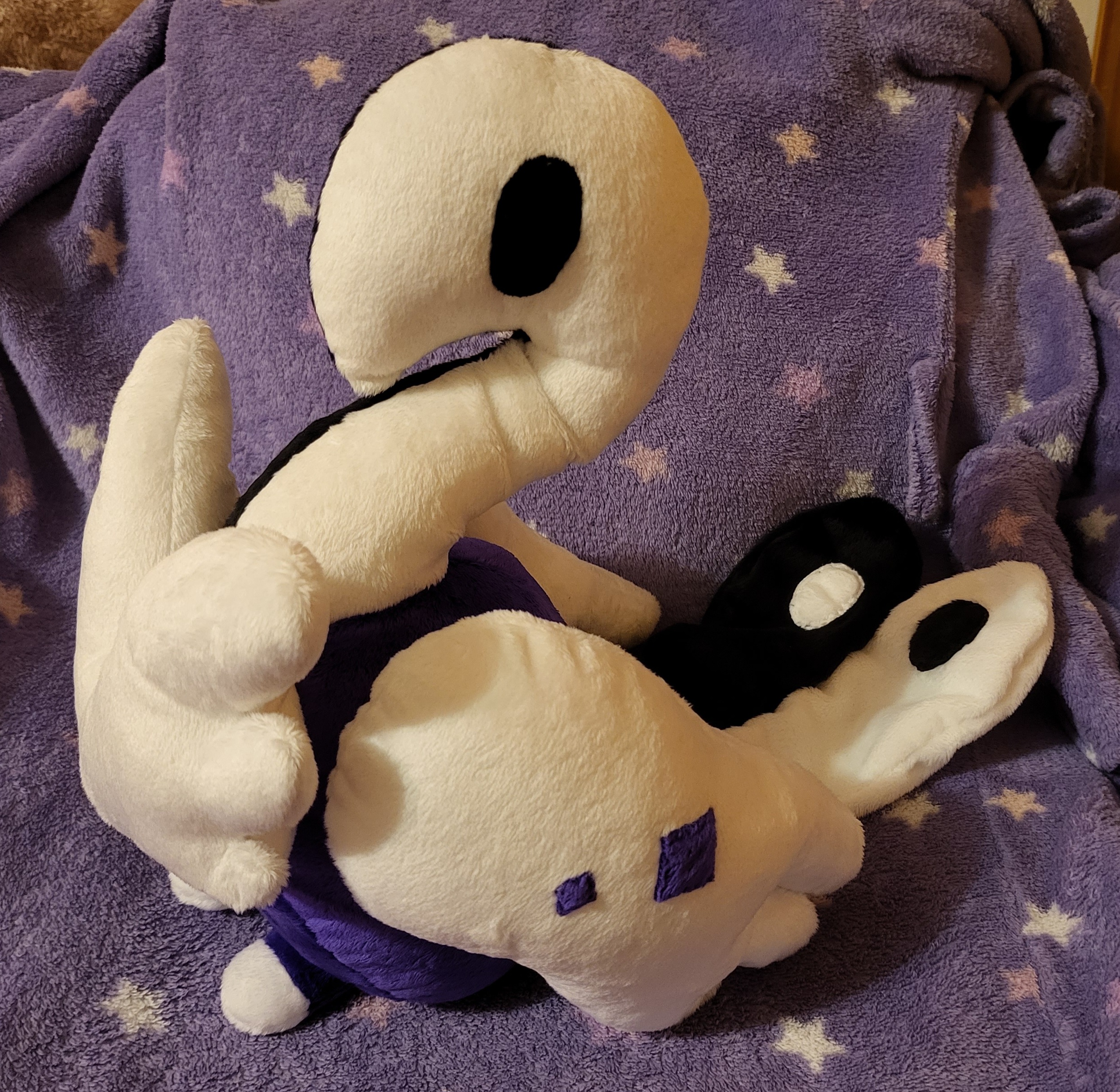 • And this is it! This is what I've been working on for myself for the past week or so. Have I ever mentioned I make plushes? Cuz I do, and here's an example of one I just recently finished!! This is a self indulgent project for myself and also my first time working with minky. And they turned out great! <333 There are a few rough edges I have with this plush, mainly just minor nitpicks like asymmetry and whatnot. But otherwise, I adore this funny fella!!