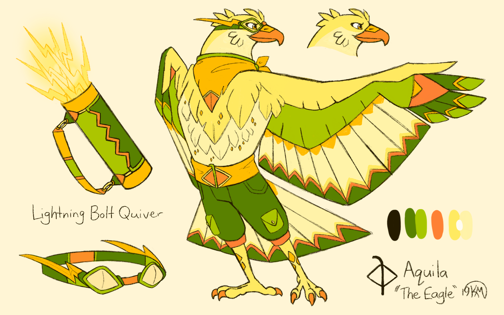 **Originally Created On:** December 11th, 2019 More birds? More birds. This is Aquila, Aquarius’s companion and fellow bolt slinger! The constellation is based on the eagle that would bring Zeus his lightning bolts, and considering Aquarius’s weather / storm theming, that seemed like a good fit. I also took inspiration from the mythical thunderbird for similar reasons. I haven’t figured out all of the size relations between the cast yet, but I picture her as a large bird that could carry others on her back while flying, which I suppose ties into her aviator theming as well. A melding of concepts, this one! I really leaned in on the angular shape language this time, aha. Her colour scheme is, admittedly, the kind I use the least in my work, so I second guessed myself a lot on her palette while making this. ^^’ If I use green at all, it’s usually more on the blue-green side rather than yellow-green, and any time I use yellow it’s either an accent or on the yellow-orange side. Still, this does help round out the colour selection of the cast a bit! I’ve got quite the rainbow going at this point. xD Only one more companion to go! ---------- The constellation symbol for Aquila was originally designed by Denis Moskowitz and released to the public domain. https://www.suberic.net/~dmm/astro/constellations_t.html