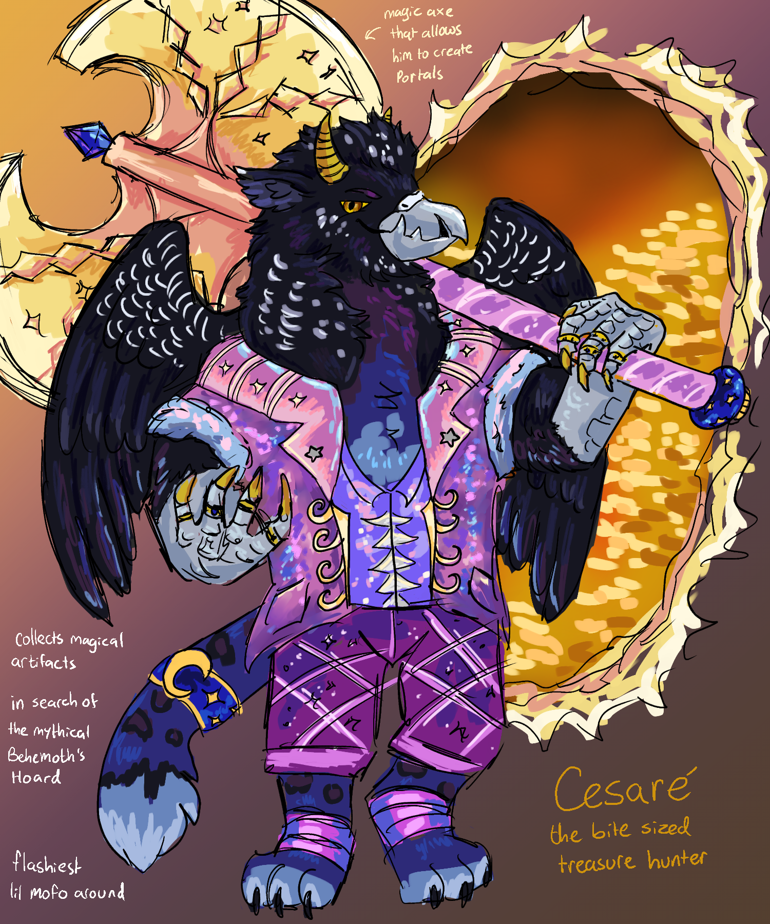 The end result of posting the "lets create a villain" meme I posted on twitter. It honestly has been done for a while I just got anxious about adding the final details for some reason. Anway here is the copypasted description i had to put in multiple tweets because of the hecking abysmal character limit on twitter. Well here he finally is! This griffin might be toddler sized but he is no pushover! This lil guy has some dragon ancestry as can be seen by the horns and unusual beak. And very much like a dragon, he is very greedy and infact hunts for and collects treasure and magical artifacts, even if those artifacts and treasure aren't his to take. His most prized posession is his divine battle ax that allows him to create portals by slicing the air or hitting a surface with intent. He can only make portals to places he can either see or has already been to he likes to use this ability to trap his henchmen in portal loops when they ask stupid questions or are bothering him too much. The treasure he longs for the most is the mythical behemoth hoard. There are tales of a golden behemoth that lived on isla dracon long ago.. and said behemoth was said to have a mountain full of gold. Cesare has been looking into every cave but so far no sign of this beast or it's hoard.. Oh well, there are tons of other shiny artifacts to steal in the meantime.