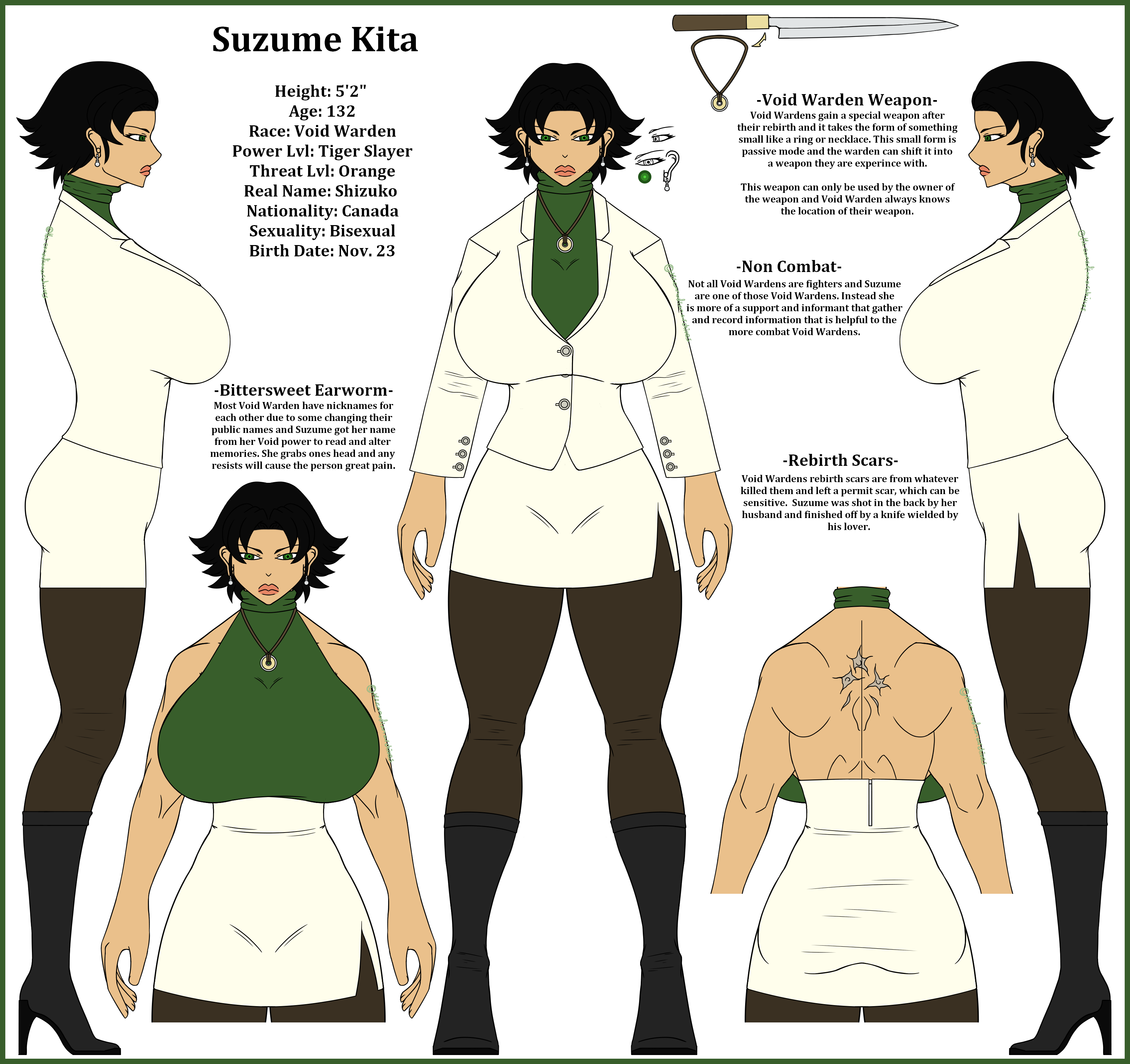 **Height**: 5'2" **Age**: 132 **Race**: Void Warden **Power** **Lvl**: Tiger Killer **Threat** **Lvl**: Orange **Real** **Name**: Shizuko **Nationality**: Canada **Sexuality**: Bisexual **Birth date**: November 23 **Likes**: Tea, Nicholas, Citana, sushi, cigarettes and warm weather **Dislikes**: Worms, Traitors, war, and extremists **Personality**: Suzume is was very intelligent and logic thinking woman but she can be vindictive if she feels slighted. When she gets back at someone it will be slow and painful experience for the victim. To those show her kinds she will return that kinds ten fold and will protective of her close ones. **Extra Information**: Suzume often works with Nicholas on Void Warden duties due to her non combat status as a Void Warden. She is trusted friends with Nicholas and Citana to the point that the married couple have invited her into the bedroom to spice things up. **Bio**: Suzume was born in the year 1890 Japan and she had simple life in the country side. At the age of 10 she was almost kidnap but she stop him with a nanairo knife to point of the kidnapper being disabled and Suzume didn't flinch to finish him off. After this moment her parents looked to marry her off as soon as they could and she got married at the age of 16 than moved to Canada with her husband. For 4 years Suzume and her husband tried for children but Suzume would keep having miscarriages and finally her husband lost interest causing great strain on their marriage. One night after coming back from her part time job she was shot in the back three times and she didn't die allowing her hear her husband telling someone to finish her off. Suzume tried to crawl away into ally before feeling a knife slide into her back twice before blacking out. Suzume woke up with large gasp and very large hand on her should keeping her down, as well a deep male voice telling to breath. She panic a bit before start breathing slowly and seeing the man keeping her pinned, it was Nicholas Overland. He had found her body and saw the marks of her transforming into a Void Warden. Nicholas and Citana took in Suzume and explained everything about Void Wardens and other mythical beings around the area. After getting new footing as a Void Warden she worked up a plan with Citana to mentally torture Suzume's cheating husband and his mistress. Nicholas thought they should just kill him but didn't stop them and would help if asked. After a years her husband went crazy and killed himself, while Suzume screwed over the mistress by claiming the insurance money from her husband's death. With that money she opened a a Sushi-ya, a restaurant that specialize in sushi, and she still running it to this day.