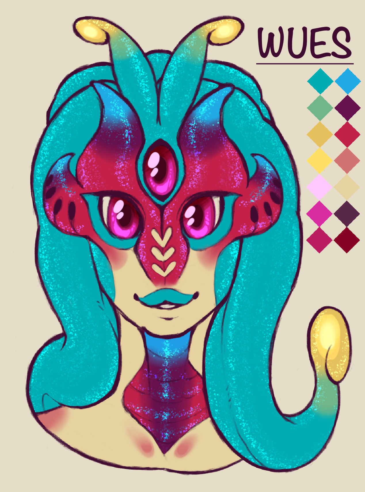 This is a redesign of Wues (pronounced as Hughes) Old Design: [Wues previous](https://www.furaffinity.net/view/40613334/) Some concept art of my original species called Salaphires. They’re going to be an open species in the future, but for now they are closed to the public as we work on the lore for Atticus, their home planet. Also their biology still needs to be worked on as well.