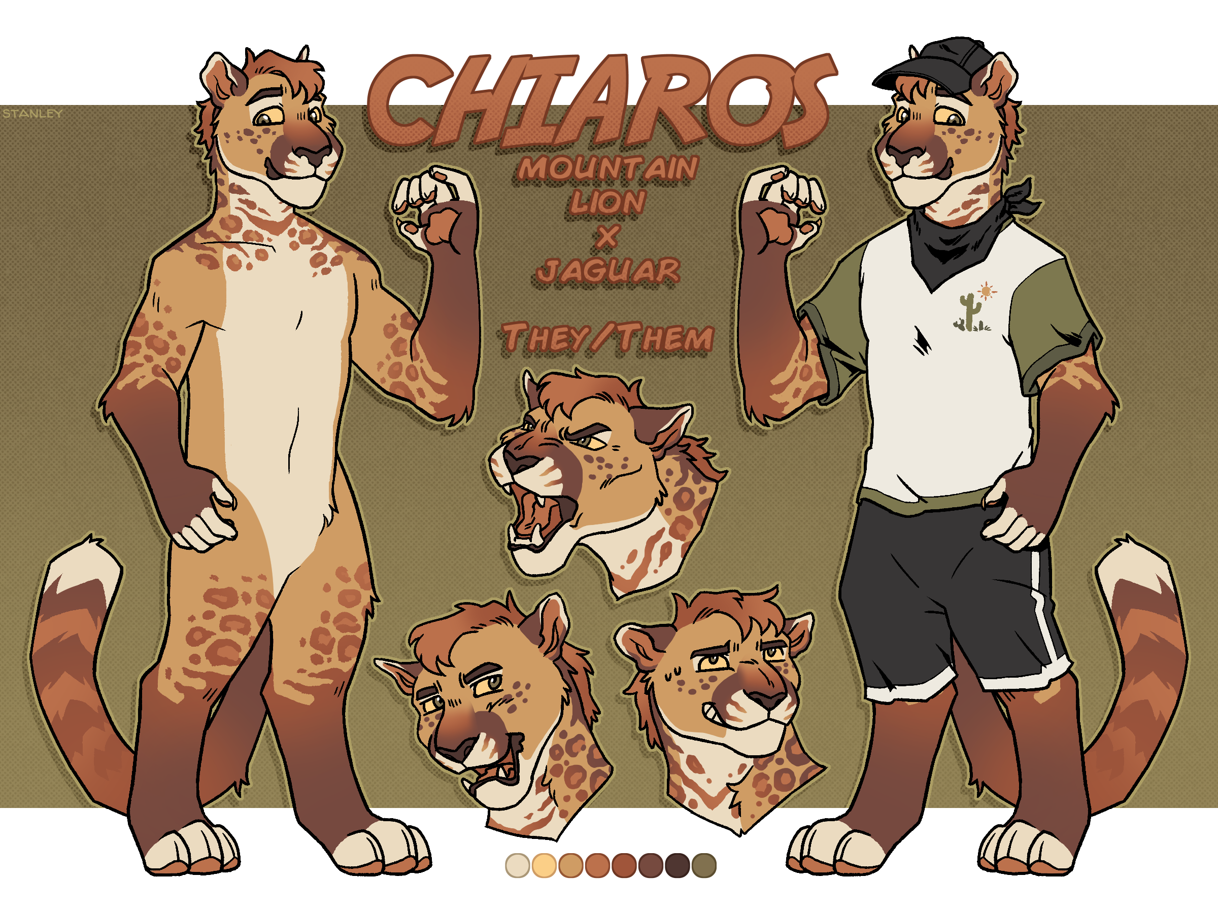 i made my fursona ten years ago in 2013 and have continuously updated their design every year since then. for most of that time they've been a big cat, but the last two years i changed them to be a coatimundi and then a ringtailed cat. this year i decided to return to their original species combination of mountain lion x jaguar in honor of this being their 10th year existing! really pleased with this design, i think it's super fun :D plus it's nice to have them back as a familiar species. coati and ringtail were fun but i just feel better with them as a big cat again.