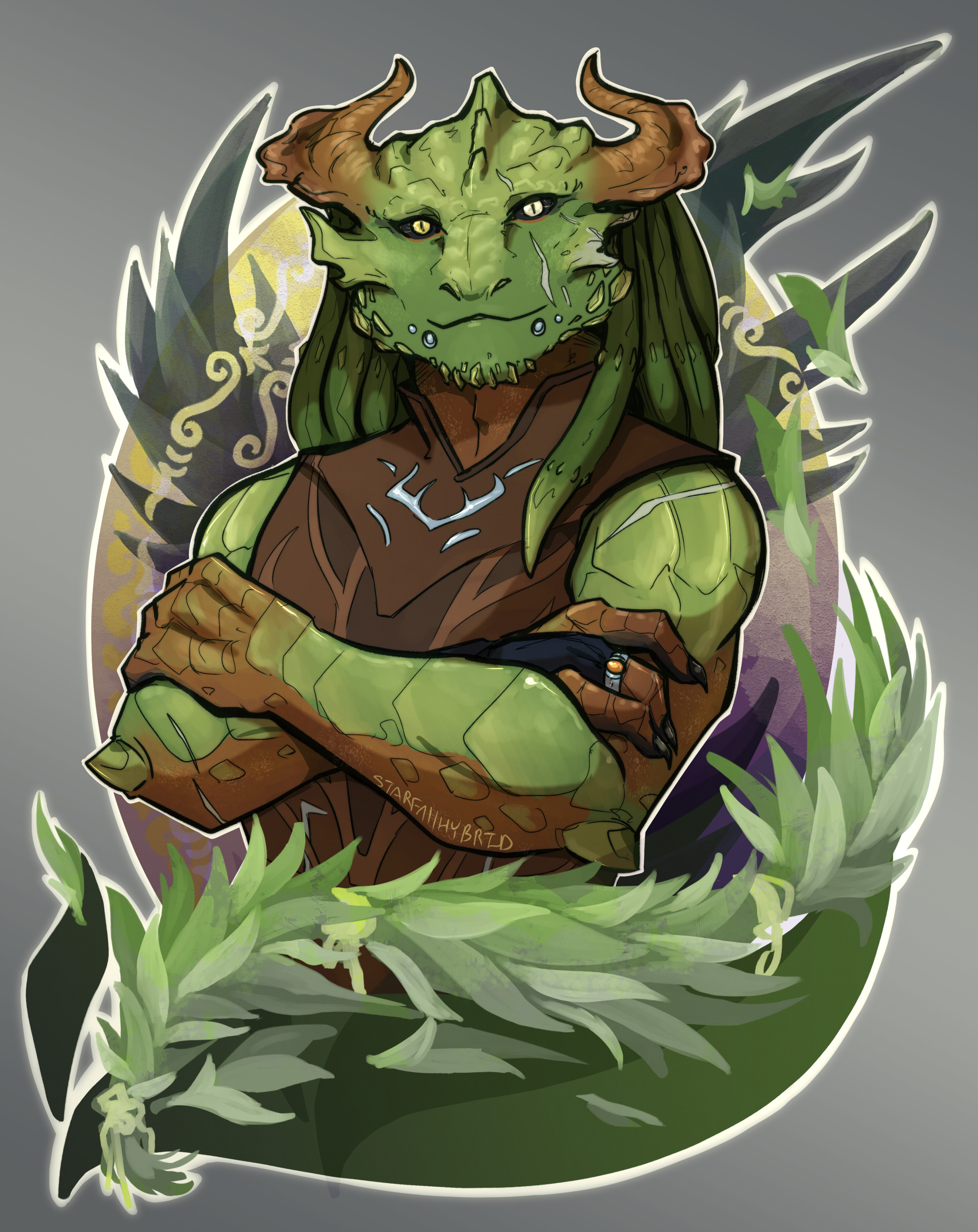 His look as of my place in BG3. I sorta paused a bit while I waited for patches, and realized my game was bugged so I had to reload a bit of progress. I also realized I've been messed up his arm colors for a while now xD Now behold, some information about Eligar •Eligar was an orphan found in the Lower City of Baldur's Gate, where he was taken in by a passing couple •Supposedly, Eligar had a brother that got lost when they arrived to Baldur's Gate alongside him but was lost. As the years have pass, Eligar struggled to remember more about his brother, including his name. •Eligar has the occasional intrusive thought, which led to some lockpicking tendencies. Which led to his father teaching him how to do it •More often than not, Eligar forgets he can wildshape. When he does, its often into a cat •Eligar is generally polite and selfless, but there are times where the sass is too strong or the irritation too unhinged to hold back. •Too often Eligar fucks around, and too often he finds out, whether it be exploring or not reading the signs •Left unattended, he will adopt anything •Eligar isn't his birth name but his adopted one. His original name was Eirukar but was changed •Following a battle within the Cursed Lands, within a certain temple, Eligar lost part of his cheekbone horn •Put enough pressure on him and he will freeze up and squeal like a threatened gecko Ya like? Support me here: https://ko-fi.com/starfallhybrid https://www.patreon.com/starfallhybrid