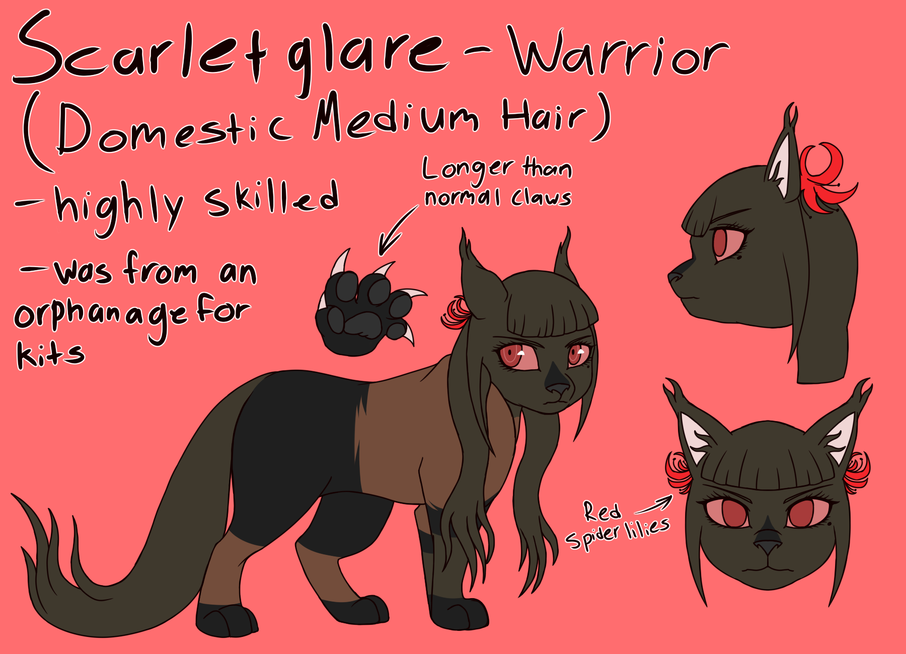 despite claiming to be an expert in kit-watching, she is actually a very skilled and dangerous warrior. having been taken from an orphanage for rogue kits, she was originally from a clan that killed often as a means of fighting and has many a body count. since she was an young apprentice, she was taught how to violently take out other cats in a manner of ways. over time she simply got used to it, shutting off her emotions at the sight of their victims. she eventually left, but had to conceal her past upon joining Harmonyclan. Nighttrick is very suspicious of her due to her cold, intimidating nature and arguably advanced fighting skill for someone who claims to just be a kit watcher.
