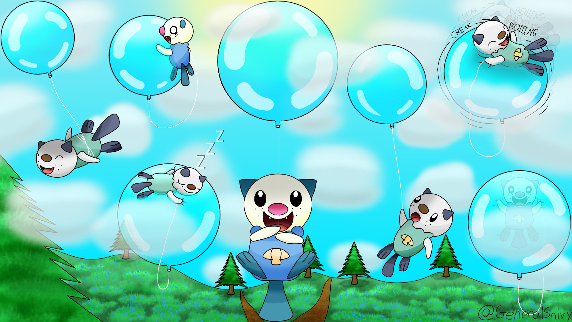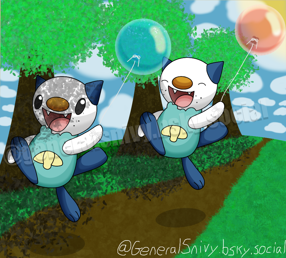 I got inspired to draw this after seeing one of the (Almost) Daily Oshawott tweets by [@/FrostyAlmonds (aka, AL (With an L) on Twitter)](https://twitter.com/FrostyAlmonds) and I wanted to draw something like that, but go further and put my own spin on it. Plus, practice drawing Oshawott in various positions and different facial expressions for most of them. [Here's the tweet that inspired this drawing.](https://twitter.com/FrostyAlmonds/status/1637921957634248705) As mentioned previously, I wanted to get in more practice drawing Oshawott, drawing them in various poses, and giving them different facial expressions. After drawing the first one, drawing the rest didn't take as long due to the fact that I was able to copy and paste various parts of their body and redraw certain parts as needed. This, of course, was done during the sketching phase of the drawing as doing it during the line art phase would've been disastrous due to the fact that the line art is a paint layer, and transforming it would greatly reduce its overall quality. (For those wondering, I don't know how to use Vector layers to draw things in Krita.) As for the background, I wanted to practice drawing more of a perspective landscape as I haven't drawn something like this in a while. I could've gone with a sky background, filled with fluffy clouds + the sun, and be done with it, but I wanted to attempt something more and I like the way this turned out. As for the pine trees, I remember seeing a tutorial on drawing trees somewhere (Although, I can't remember where, exactly) and tried to recall the part of it where I had to break it down into its simplest shapes, and then work from there. I also messed around with one of the default grass patch brushes in Krita to add details to the trees and it worked surprisingly well, thanks to the different blending modes such as Multiply, Screen, Burn, etc. Overall, this took several days to finish and it was a fun project! The experience gained for everything was well worth it and it'll be useful for future drawings! [Balloon bounce referenced](https://www.deviantart.com/balloon-quilava/art/Big-balloon-bounce-874473076)