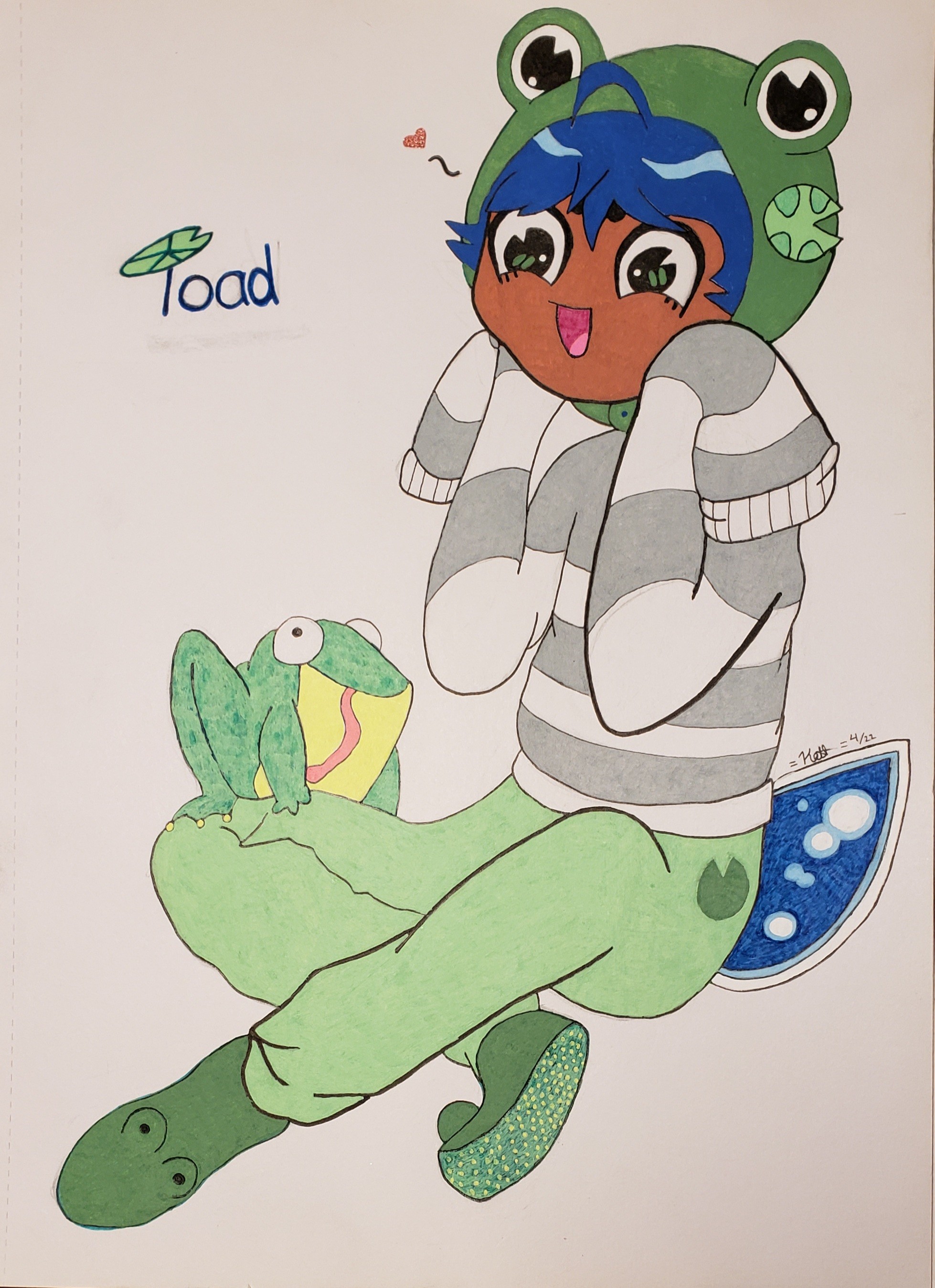 • Finally got around to coloring in this sketch I made in summer 2022, this was a traditional drawing. Just extracted lines to save time, I am *kind of* happy with this though the design is blinding and unappealing. There is something so nostalgic about it though, so I haven't redesigned the colors. This character was designed in 2016, here are some facts child me wrote: