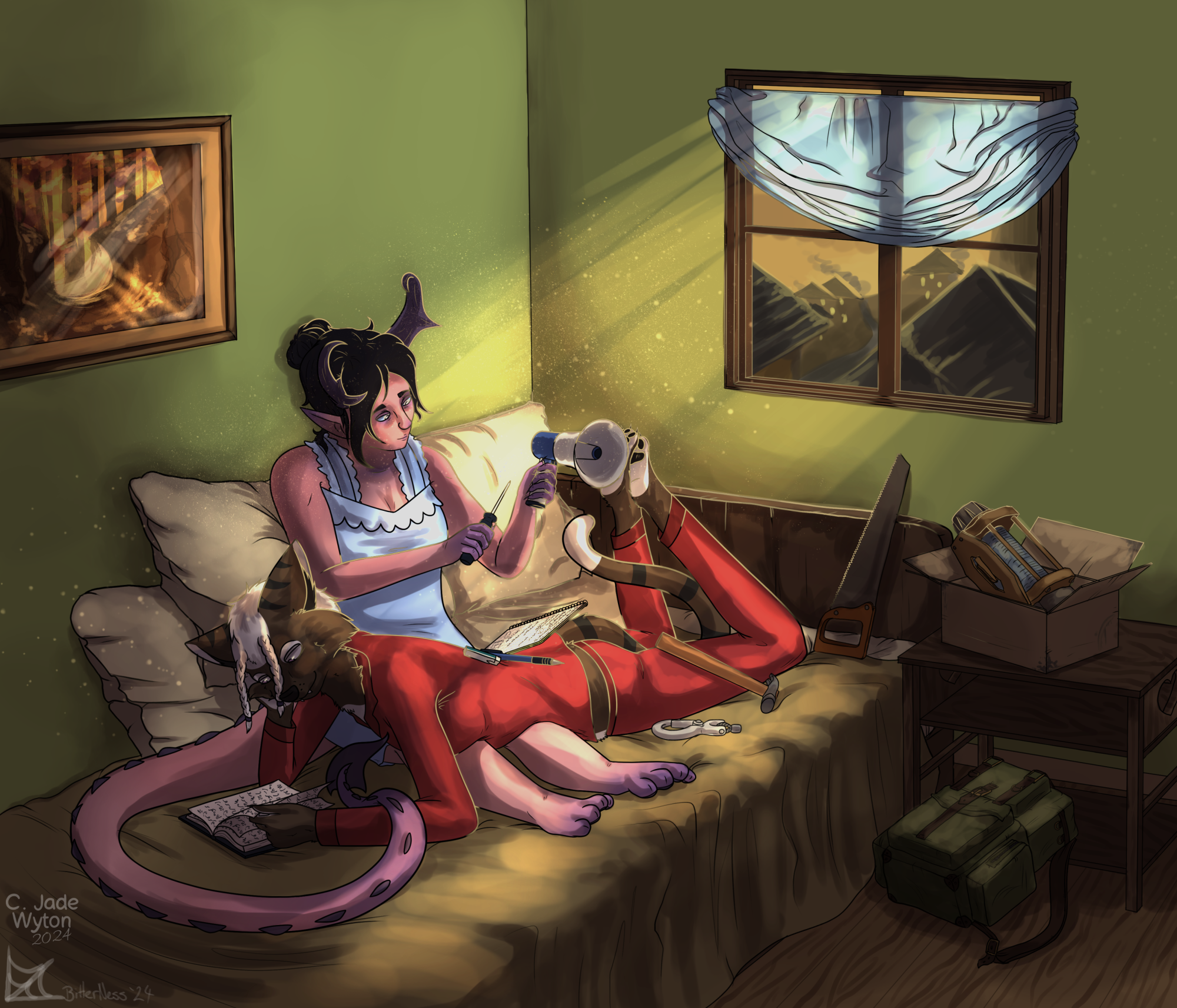 A collab with my good friend, bitterrness (twitter) !! Two of our characters hanging out peacefully (instead of causing their usual mischief)