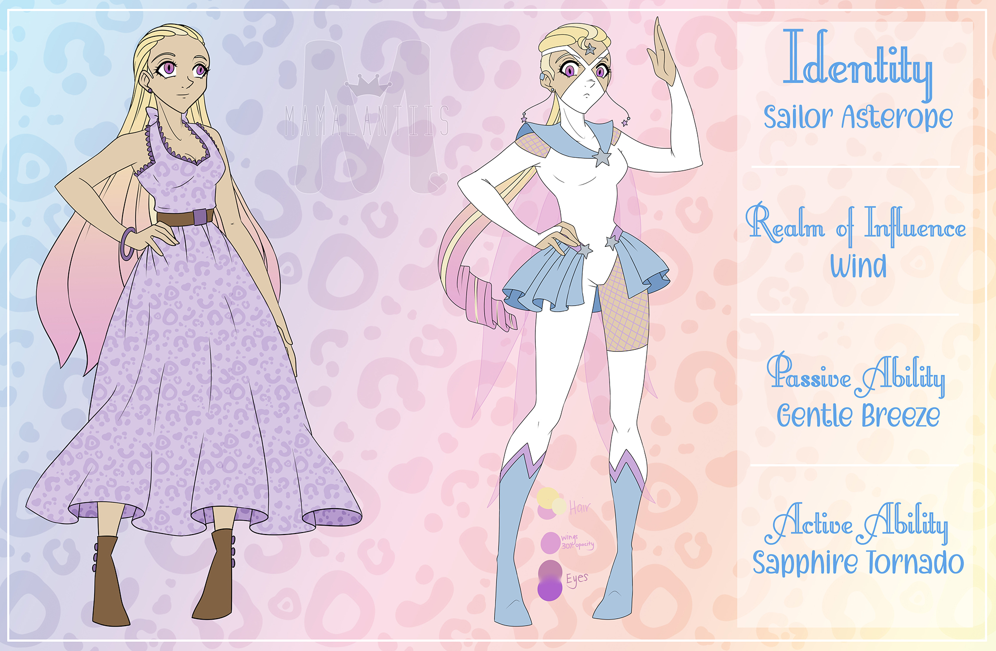 ON TH: https://toyhou.se/27347657.sailor-asterope Senshi Identity: Sailor Asterope Civilian Identity: Lillaraea [Asterope]; Astella James [Earth] Realm of Influence: Wind Passive Ability: Gentle Breeze - creates a constant breeze around Sailor Asterope making her partially immune to any powers and abilities that need to touch her by air. Active Ability: Sapphire Tornado - summons a deadly and destructive tornado that wreaks havoc in any direction Sailor Asterope chooses to send it [and she can change its trajectory with concentration]. Species Ability: Flight - she has wings that allow her to fly. Magical Item: None. Age: 42 [for her species, that is early adulthood - around 22 years old human years] Likes: cats [she has found a love of cats when visiting Earth], flowy clothing, bright colors, fruits, getting to the point fast Dislikes: meat [she won't eat it - her whole species doesn't consume meat - she's baffled by species that do eat meat {even cats}], indirect people or shy/quiet people, small talk and gossip Primary Color: Light Blue Secondary Color: Lavender Accessory Color: Silver SPECIAL SENSHI NOTES Asterope's hair is belted in place by the piece of mask that goes around her forehead. It is like a ponytail holder for her hair when in Senshi form. SPECIAL CIVILIAN NOTES Sailor Asterope has developed an alter identity, Astella James, for use when she travels to Earth. Asterope has a romantic view of Earth and is obsessed with cats! When on Earth, she hides her wings in belted dresses and keeps her hair long and down. She has managed to acquire some Earth money and a small plot of land where she keeps a dozen of her favorite pet cats in a little one bedroom cottage. Outside of her FREQUENT travels to Earth, Sailor Asterope does not have a civilian identity and prefers her senshi form. ASTEROPE: The Butterfly Clan The planet Asterope is a lush green planet that is largely peaceful and home to a race of butterfly people with varying types of wings [wing types are generally a family attribute and genetic]. The planet is green and blue with some smaller lakes here and there but large lush forests. The people of Asterope live in the skies and land in the trees where they build their homes. Larger more formidable and carnivorous animals live on the ground, so the Asteropians do not venture there unless they must for food/medicine [there are very few plants they forage from the ground - most of the ones they get for food are found in the trees but some herbal remedies for illness or injury can only be found on the ground]. Asterope has gone centuries without a senshi being born. The last senshi was killed off by some rogue senshi passing by their planet. Being underdeveloped, the rogue senshi left after claiming the life of Sailor Asterope. Once Lillaraea was found to be a holder of a starseed and able to transform, the elders took her name and renamed her Sailor Asterope, the first senshi they have had in centuries! And she lives among her people as Sailor Asterope, training in the trees and battling the creatures on the planet's grassy plains and lakes. While she isn't very adept at fighting with her hands, she has a mean kick and her Sapphire Tornado attack is extremely effective, even in the dense forests of her planet. Sailor Asterope is part of InterstellarSenshi on deviantART Sailor Asterope by MamaLantiis