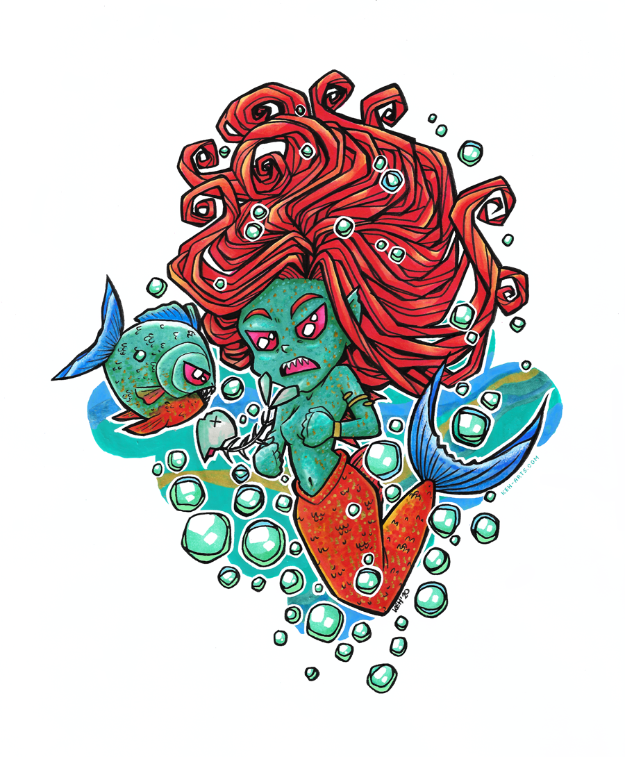 I have a piranha mermaid OC imaginatively named....Piranha. I usually draw her for #Mermay She never shares her food. Mixed media - markers + paint markers